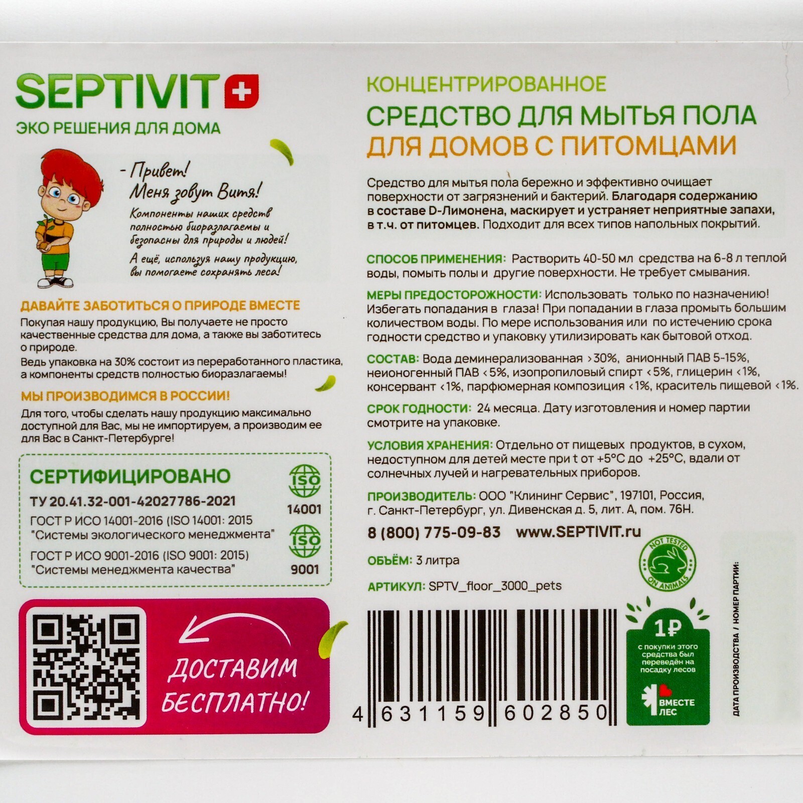 Средство для пола SEPTIVIT "Для Домов с Питомцами", 3 л