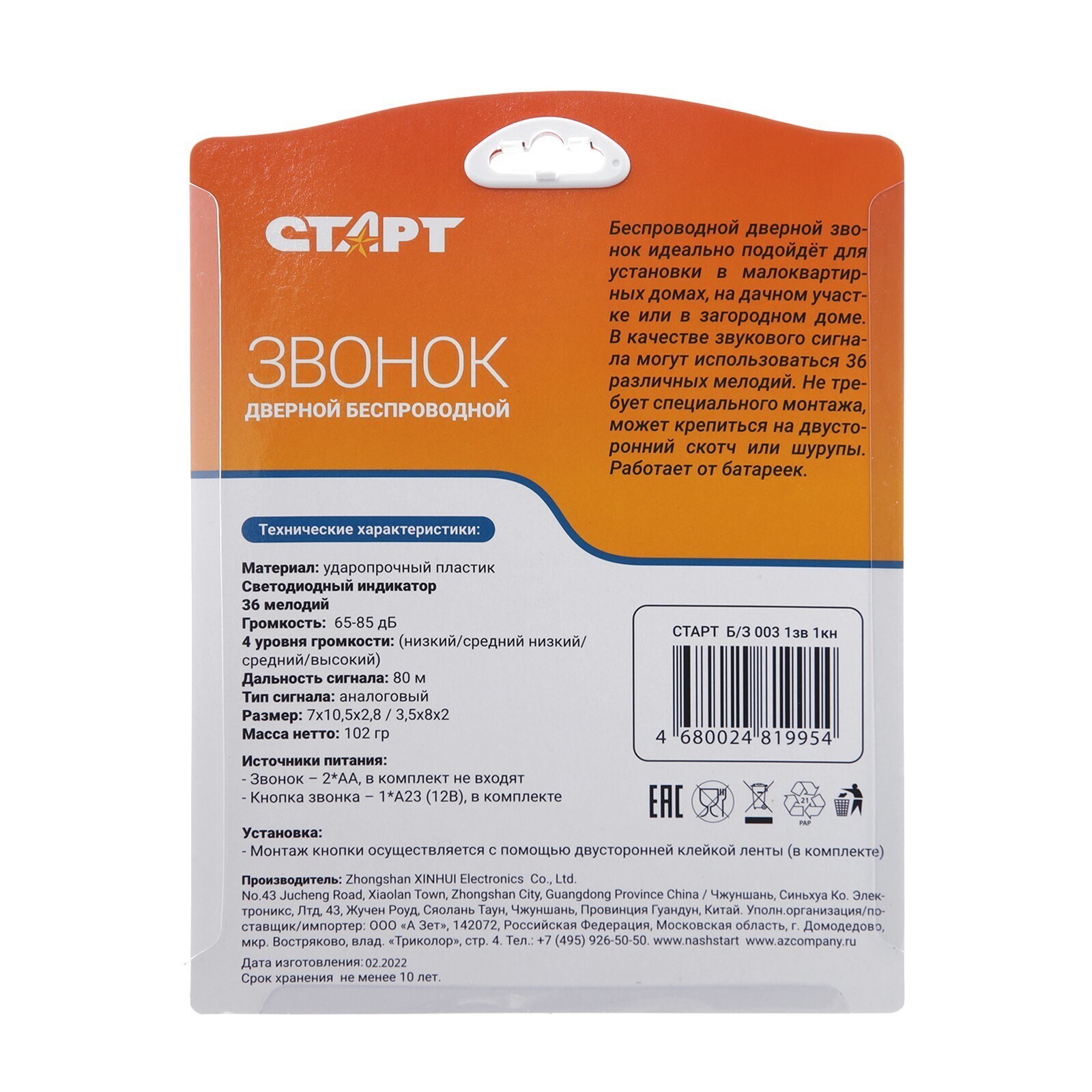 Звонок СТАРТ Б/З 003, беспроводной, 36 мелодии, 80 м, 2хАА/1хА23, белый