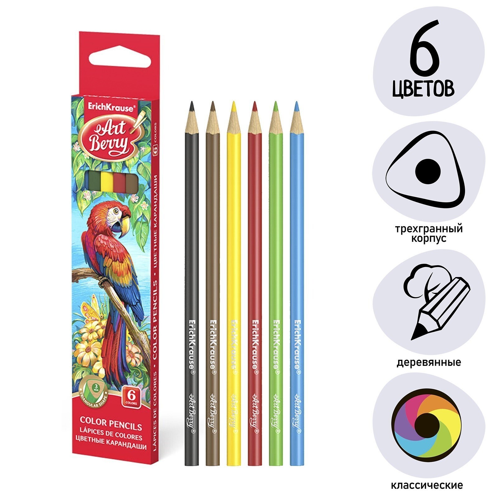 Карандаши 6 цветов ErichKrause ArtBerry премиум, дерево, трехгранные, яркий и мягкий грифель 3.0 мм, картонная упаковка, европодвес