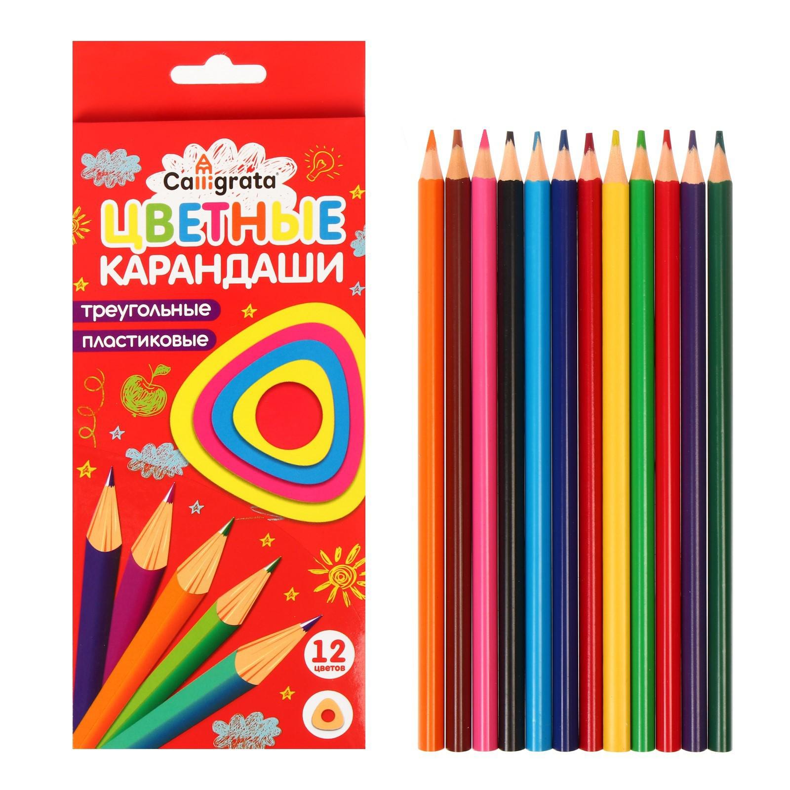 Карандаши 12 цветов, корпус трехгранный пластиковый, заточенный, в картонной коробке