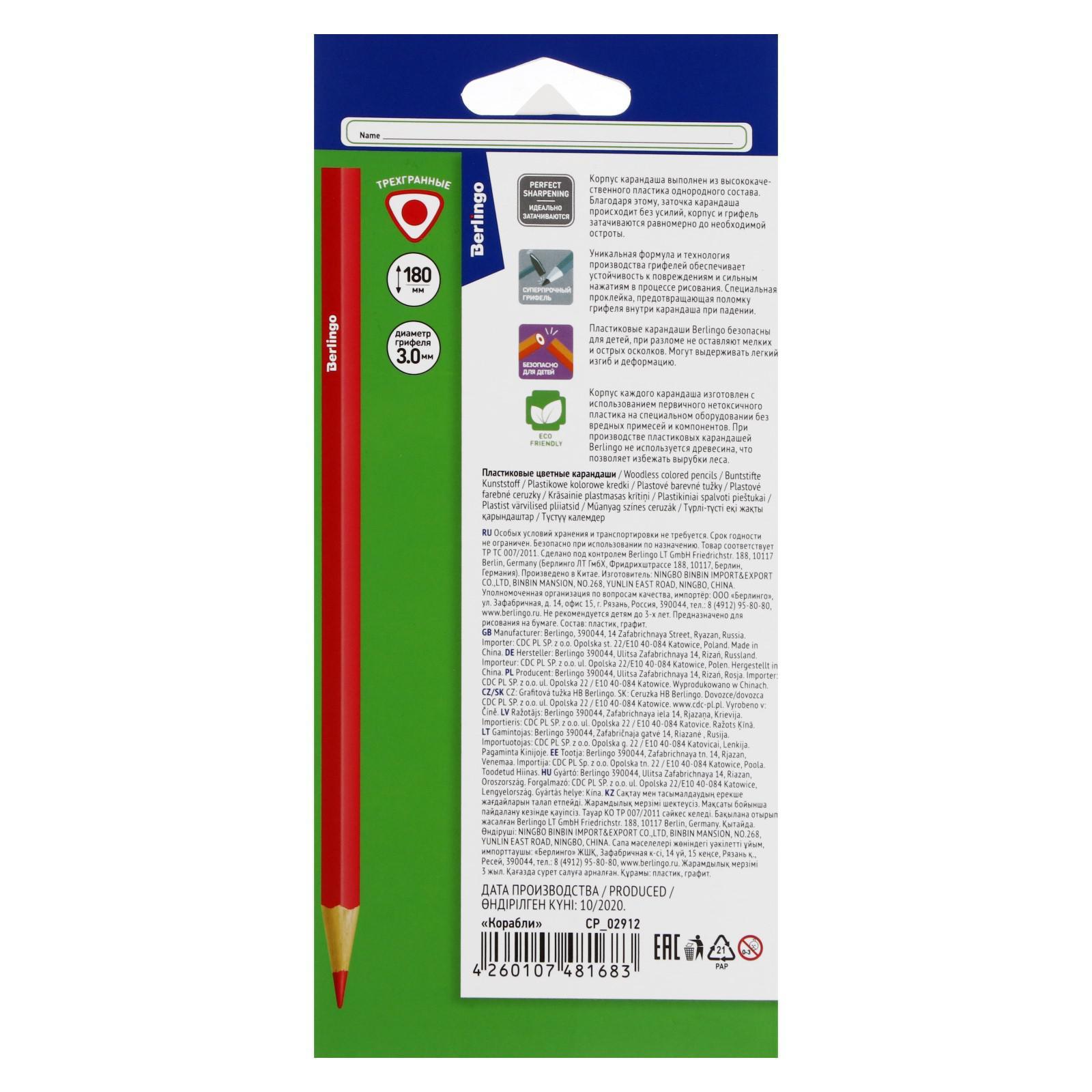 Карандаши цветные пластиковые с заточенным грифелем. Эргономичный трехгранный корпус. Мягкий яркий грифель диаметром 3мм. Грифель не ломается при падении. Гибкий корпус. В подарок чернографитный карандаш Berlingo. Яркие насыщенные цвета. Штрихи мягко ложатся на бумагу. Карандаши легко затачиваются. Упакованы в картонную коробку с европодвесом.