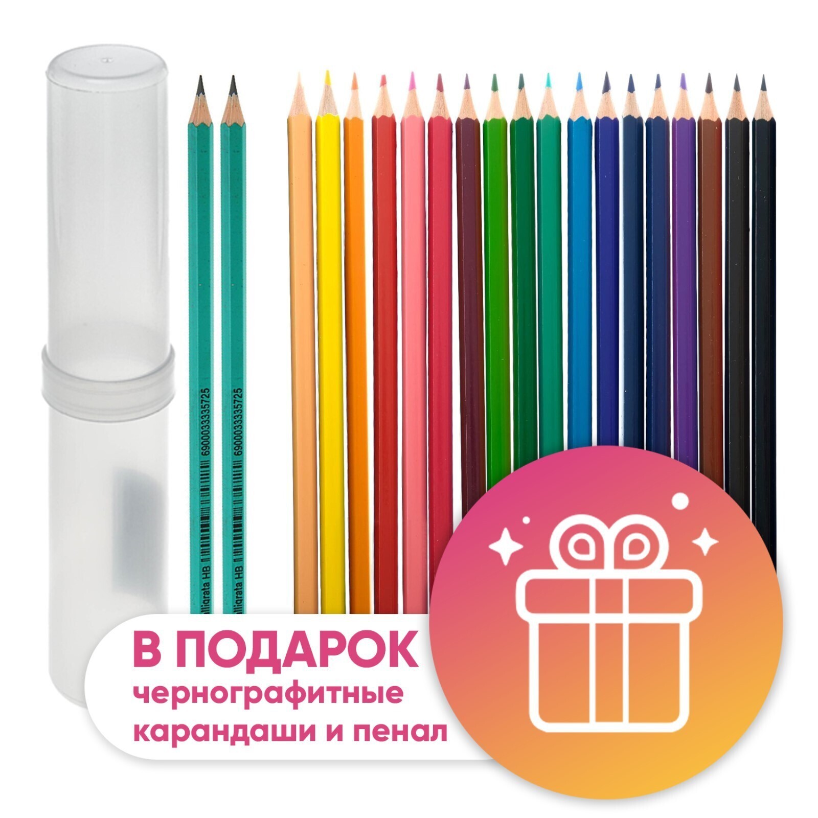 3 В 1!!!: Карандаши 18 цветов Calligrata заточенные, шестигранные, пластиковые, футляр-пенал и 2 чернографитных карандаша с ластиком.