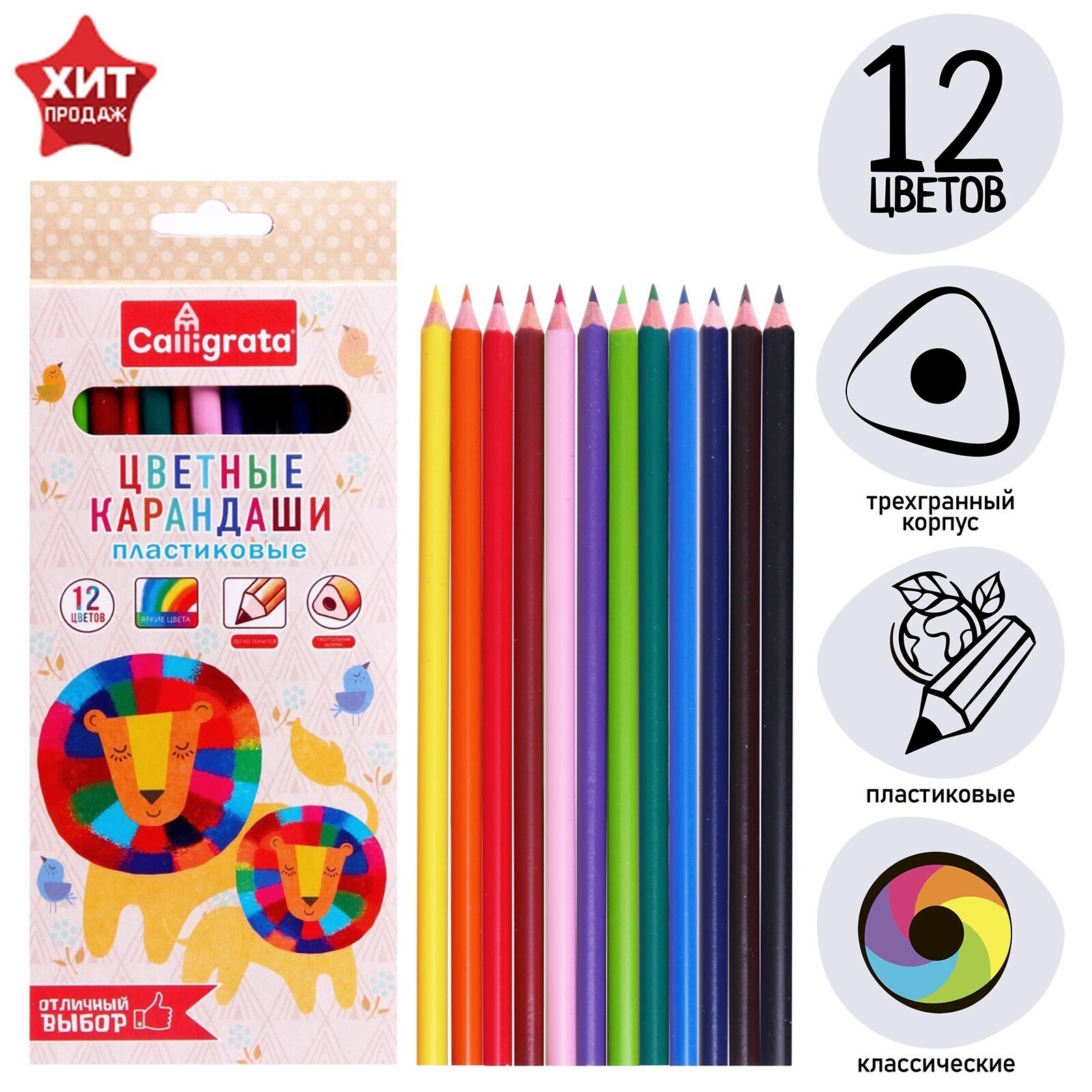 Карандаши 12 цветов Calligrata, заточенные, трехгранные, пластиковые, эконом, картонная упаковка, европодвес