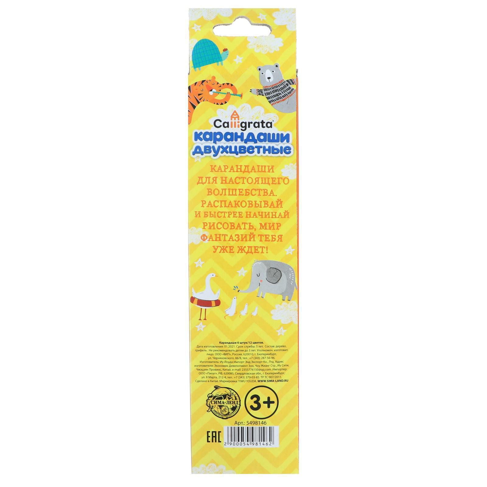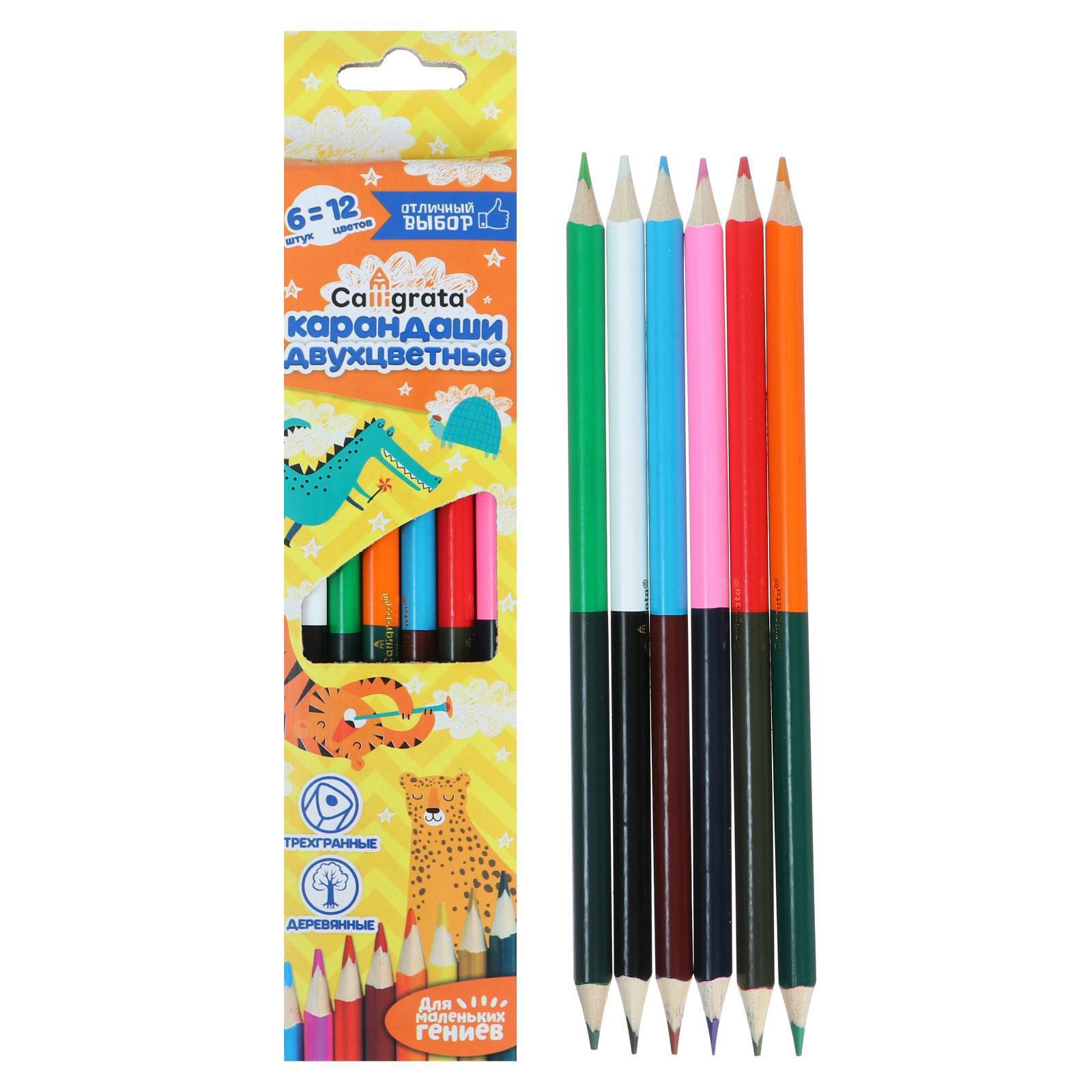 Карандаши двухцветные 12 цветов, 6 штук, корпус деревянный, треугольный, в картонной коробке