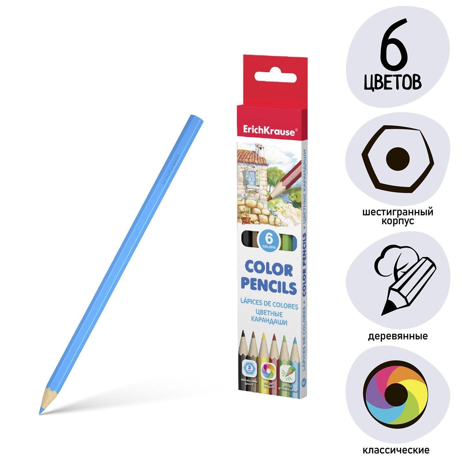 Карандаши 6 цветов ErichKrause Standart, дерево, шестигранные, 3.0 мм грифель, картонная упаковка, европодвес