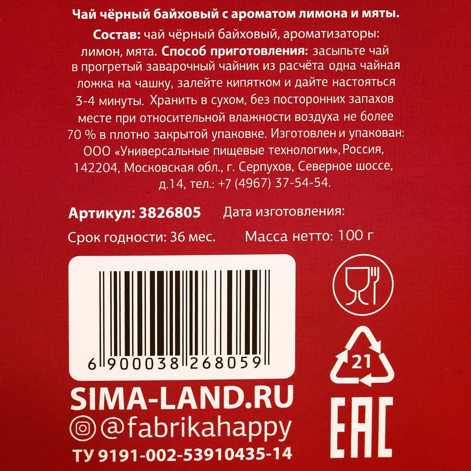 Состав: чай чёрный байховый, ароматизаторы: лимон, мята.