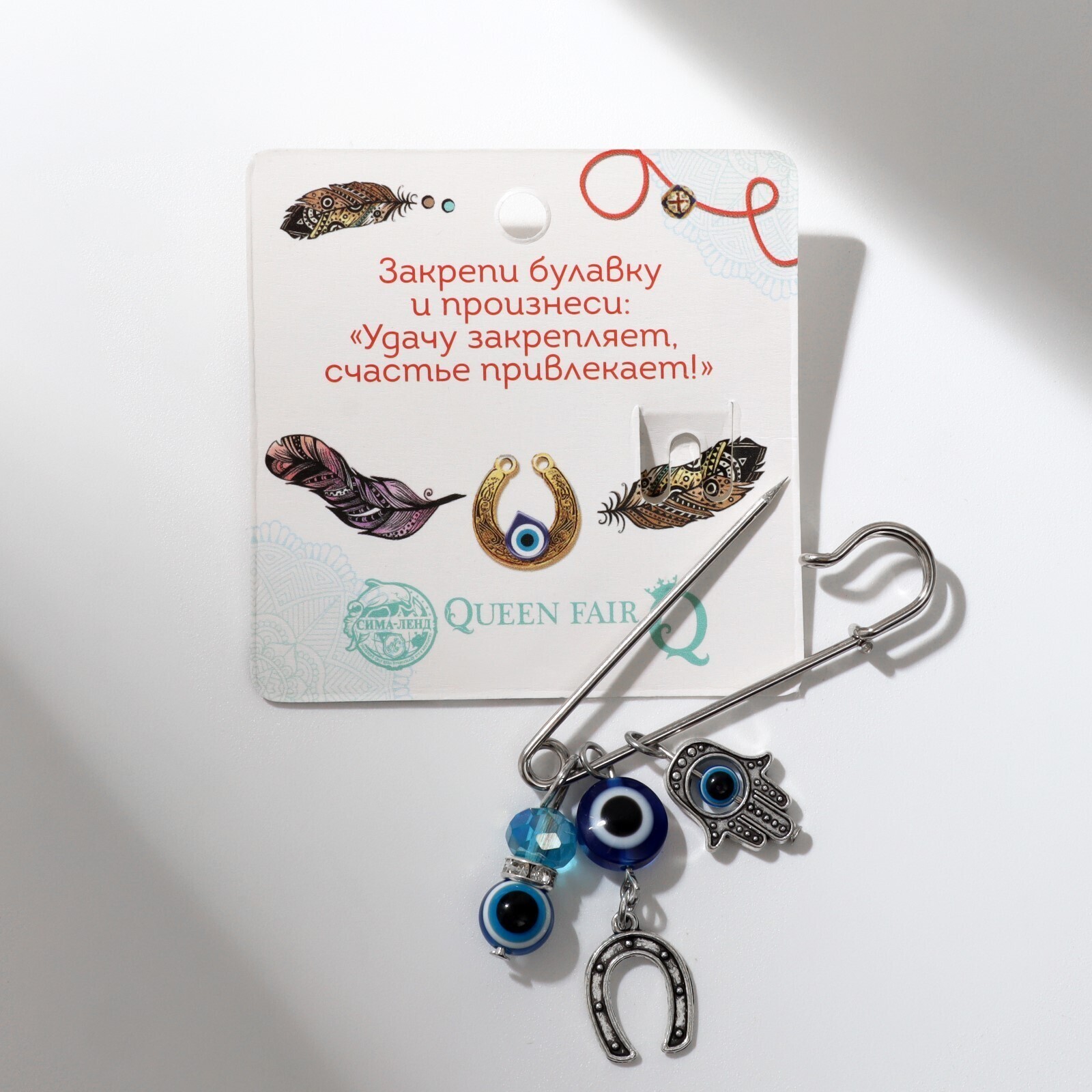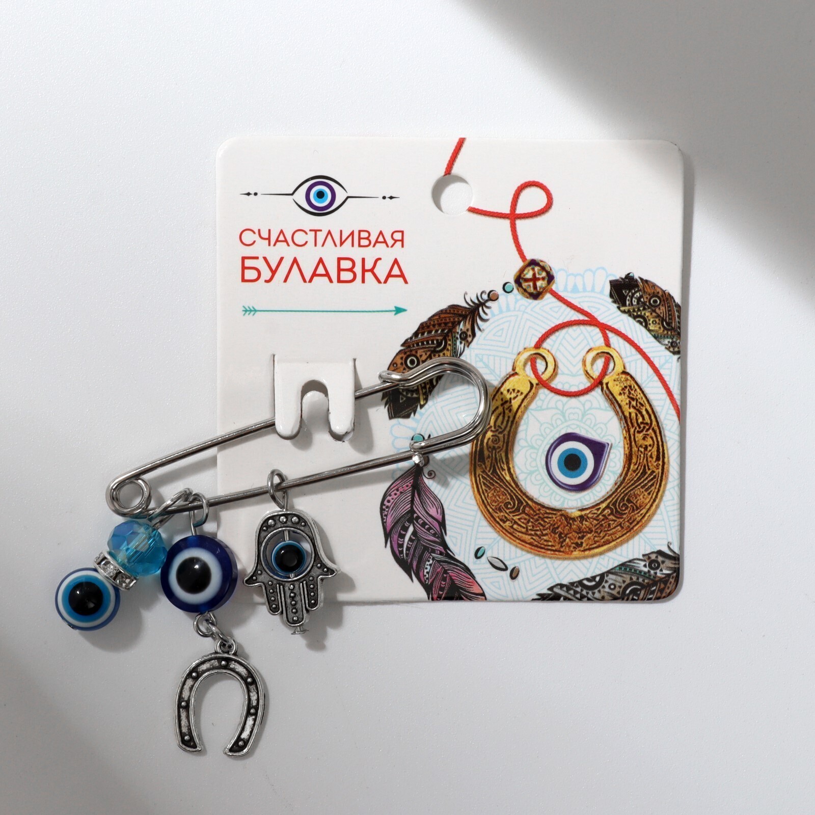 Булавка-оберег 3 подвески "Рука Хамса с подковой и бусиной", 5 см, цвет синий в серебре