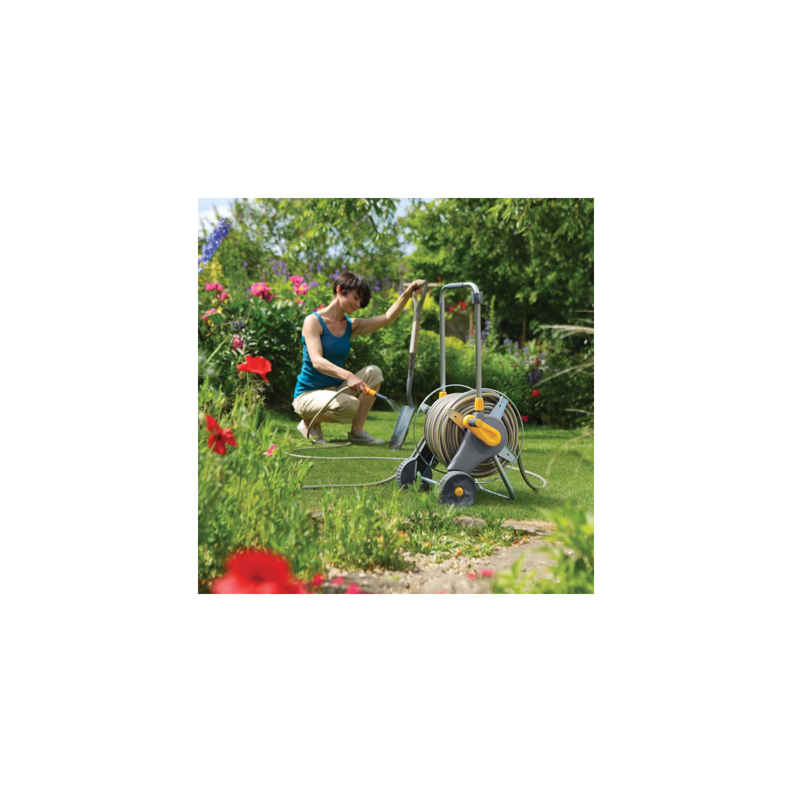 Котушка на колесах для шлангу довжиною до 60 м HoZelock, у комплекті з двома конекторами. Шланг у комплект не входить, дозволяючи використовувати власний або вибрати шланг із каталогу HoZelock. Котушка поставляється у зібраному вигляді.