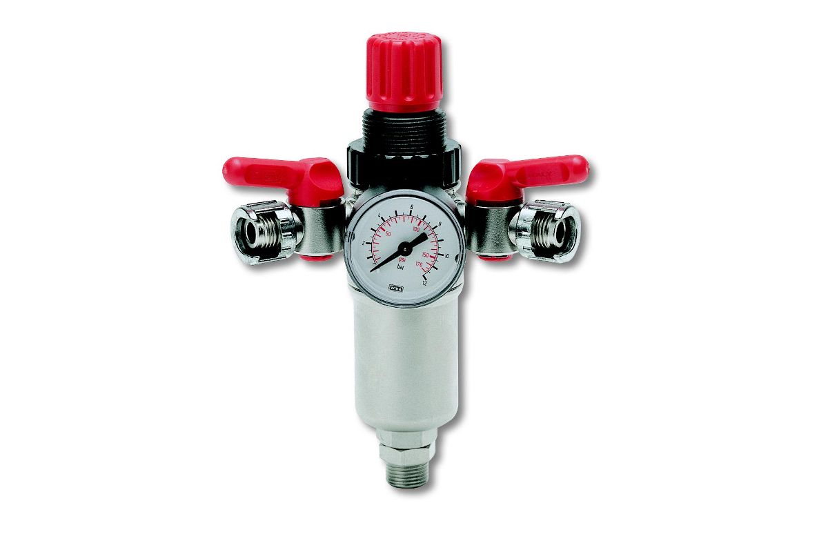 Также выполняет функцию фильтра: очищает сжатый воздух от воды, масла и пыли. Подключается к магистрали с помощью байонетного соединения. Уровень давления регулируется с помощью вентиля и отображается на встроенном манометре