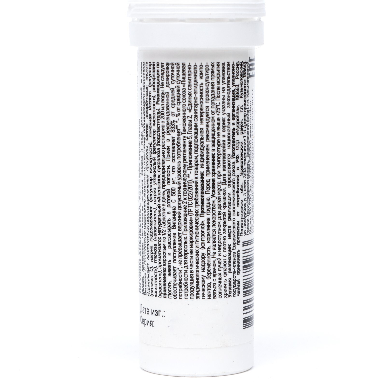Состав: Аскорбиновая кислота (витамин С), натрия гидрокарбонат (регулятор кислотности), лимонная кислота (регулятор кислотности), глюкоза (наполнитель), натрия углекислый (регулятор кислотности), рибофлавин (краситель), ароматизатор натуральный «Апельсин», сукралоза (подсластитель).