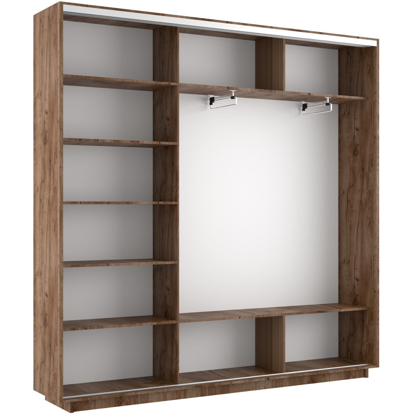 Наполнение шкафов стандартное и достаточно удобное. Предусмотрены устойчивые полки и штанга.