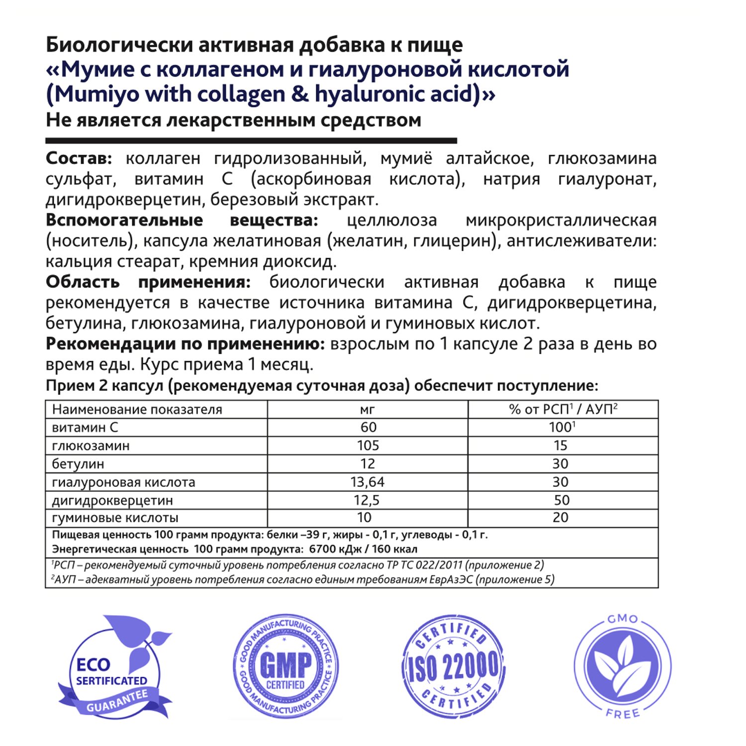 Биологически активная добавка Risingstar Мумие с коллагеном и гиалуроновой кислотой 60капсул 15761589