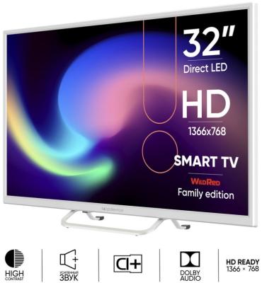 Прочие особенностиНа панели пульта предусмотрена отдельная программируемая кнопка для прямого доступа, а также вынесены кнопки-доступы к популярным онлайн-кинотеатрам. Оцените легкость и простоту управления телевизором На корпусе телевизора предусмотрено несколько портов различных видов. С их помощью легко подключить к телевизору ноутбук, флэш-карту или другое дополнительное устройство С помощью Wild Red вы можете смотреть сотни телевизионных каналов, спортивные трансляции и видео-блоги, а также выбирать фильмы и сериалы из бесплатной подборки, которую телевизор создает самостоятельно с разных сайтов. Для тех, кто любит хорошую музыку, есть специальные разделы с радиостанциями и каталоги с видеоклипами, а также тысячи фонограмм для караоке. Кстати, всем этим контентом можно легко управлять через приложение с помощью голосовых команд Делитесь контентом с экрана своего смартфона без подключения кабеля или установки специальных программ Современная аудио технология Dolby Audio обрабатывает и улучшает звук любого типа контента: фильмы, спортивные передачи или потоковое видео. Благодаря этой встроенной системе вы получите двухмерный качественный и насыщенный звук Благодаря высокому показателю контрастности у телевизора всегда четкое и насыщенное изображение, которое максимально погружает вас в происходящее на экране. Наслаждайтесь яркой картинкой в отличном качестве, не зависимо от времени суток и освещенности помещения Видео на экране телевизора с высоким разрешением High-Definition отличается хорошей детализацией и реалистичностью изображения. Получите визуальное удовольствие от качества картинки с высокой четкостью
