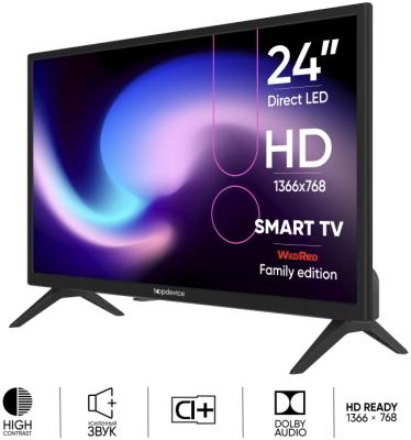 Прочие особенностиКомпактный телевизор с размером диагонали 24 дюйма отлично подойдет для небольшой комнаты, кухни или дачи. На корпусе телевизора предусмотрено несколько портов различных видов. С их помощью легко подключить к телевизору ноутбук, флэш-карту или другое дополнительное устройство. С помощью Wild Red вы можете смотреть сотни телевизионных каналов, спортивные трансляции и видео-блоги, а также выбирать фильмы и сериалы из бесплатной подборки, которую телевизор создает самостоятельно с разных сайтов. Для тех, кто любит хорошую музыку, есть специальные разделы с радиостанциями и каталоги с видеоклипами, а также тысячи фонограмм для караоке. Кстати, всем этим контентом можно легко управлять через приложение с помощью голосовых команд.