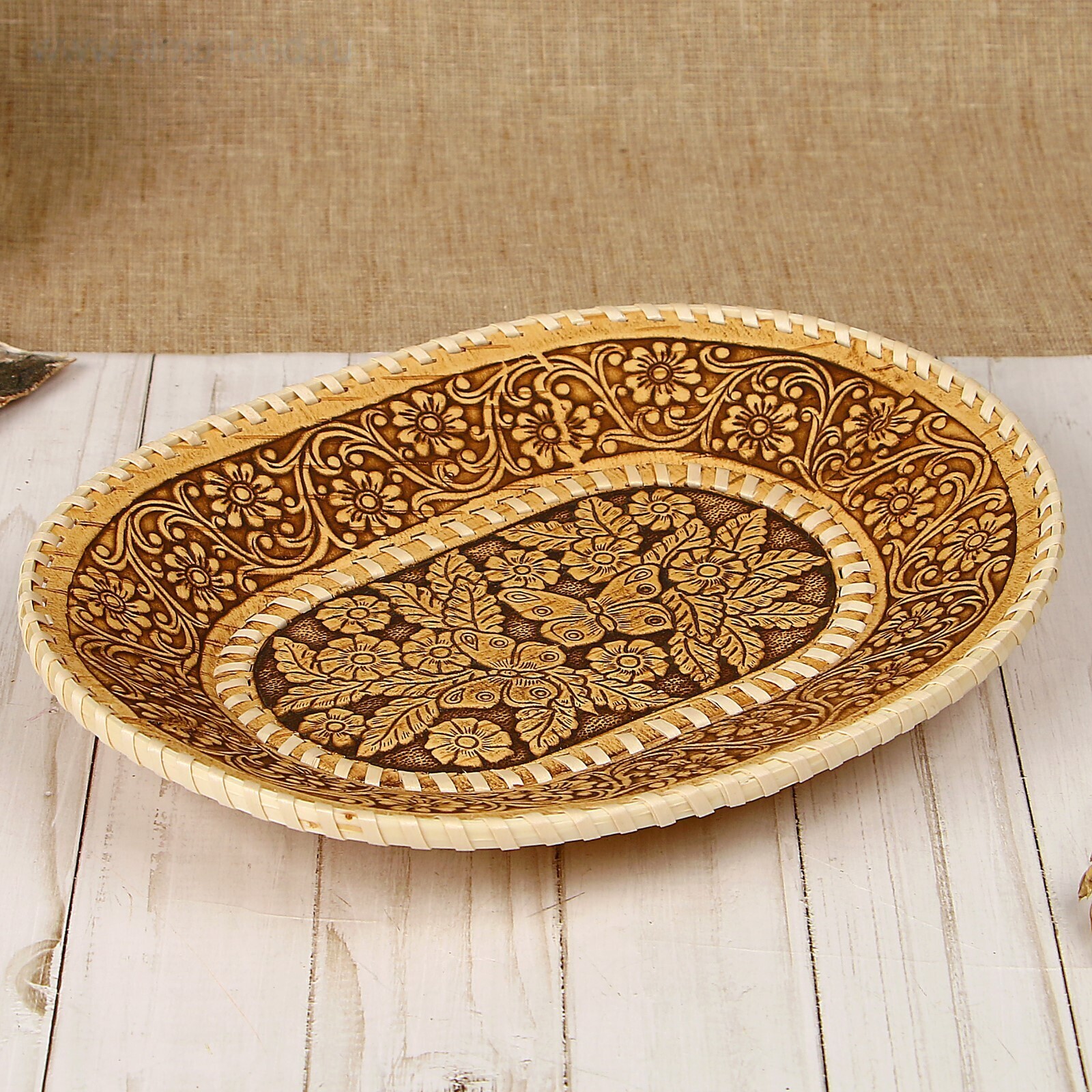 Тарелка «Бабочки в цветах», овальная, 27х21х2 см, береста