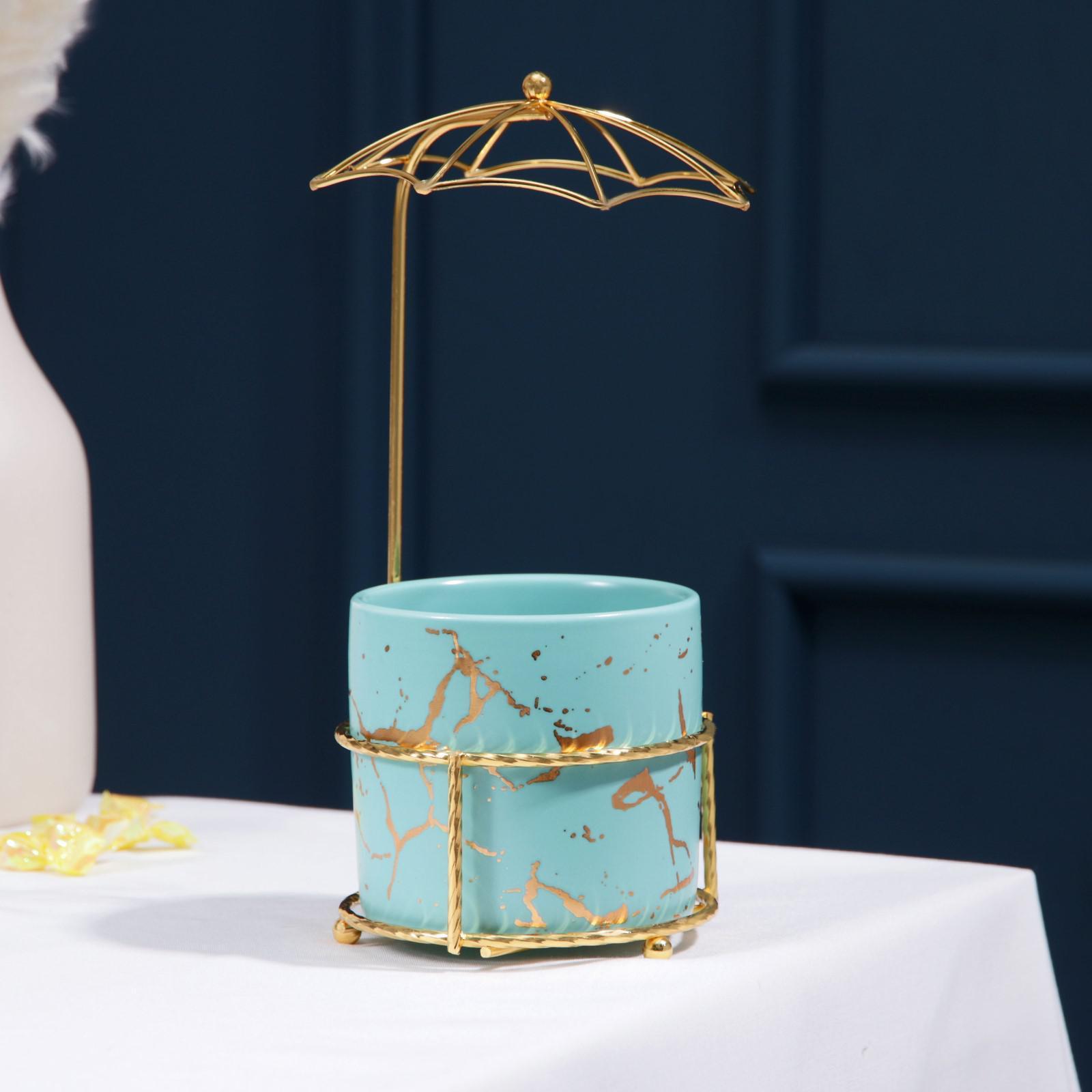 Конфетница на декоративной подставке пригодится на торжественном застолье и тихом семейном чаепитии. Емкость конфетницы выполнена из керамики, а металлическая подставка-зонтик окрашена в теплый золотистый цвет. Вазочка для конфет и мармелада станет оригинальным украшением праздничного стола. А если гостей соберется много, можно сервировать стол несколькими конфетницами - миниатюрная емкость для сладостей не займет много места.