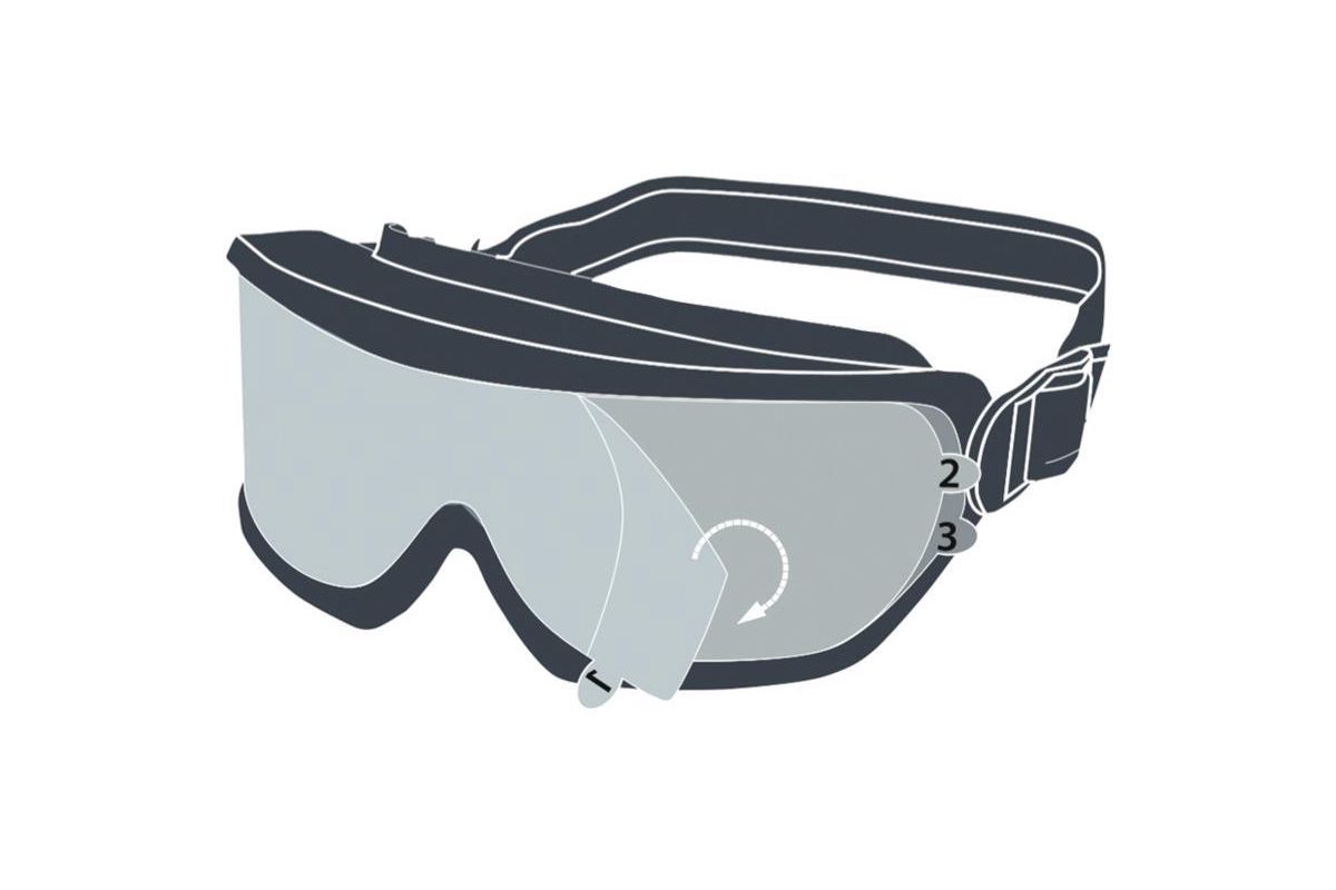 - Защита (спереди и сбоку) от летящих частиц (120 м/с) и УФ-излучения;