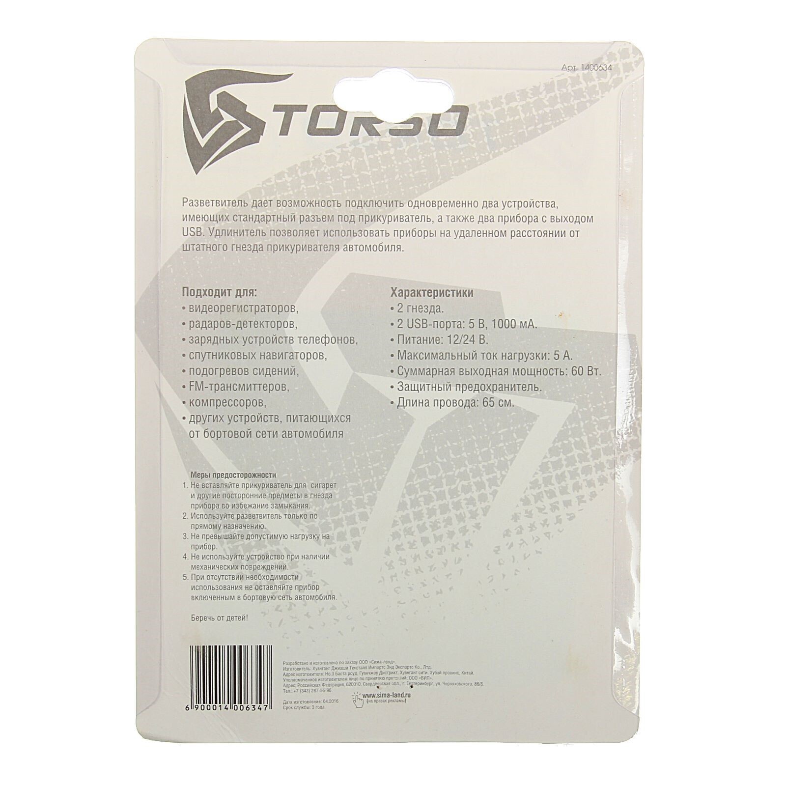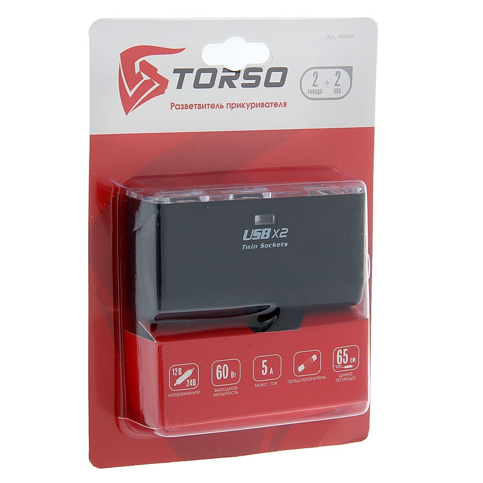 УЦЕНКА Разветвитель прикуривателя TORSO, 2 гнезда, 2 USB, 12/24 В, провод 65 см