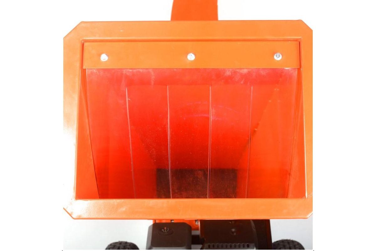 Широкий заборный бункер упрощает подачу древесины. В него удобно опускать широкие и ветвистые стволы.