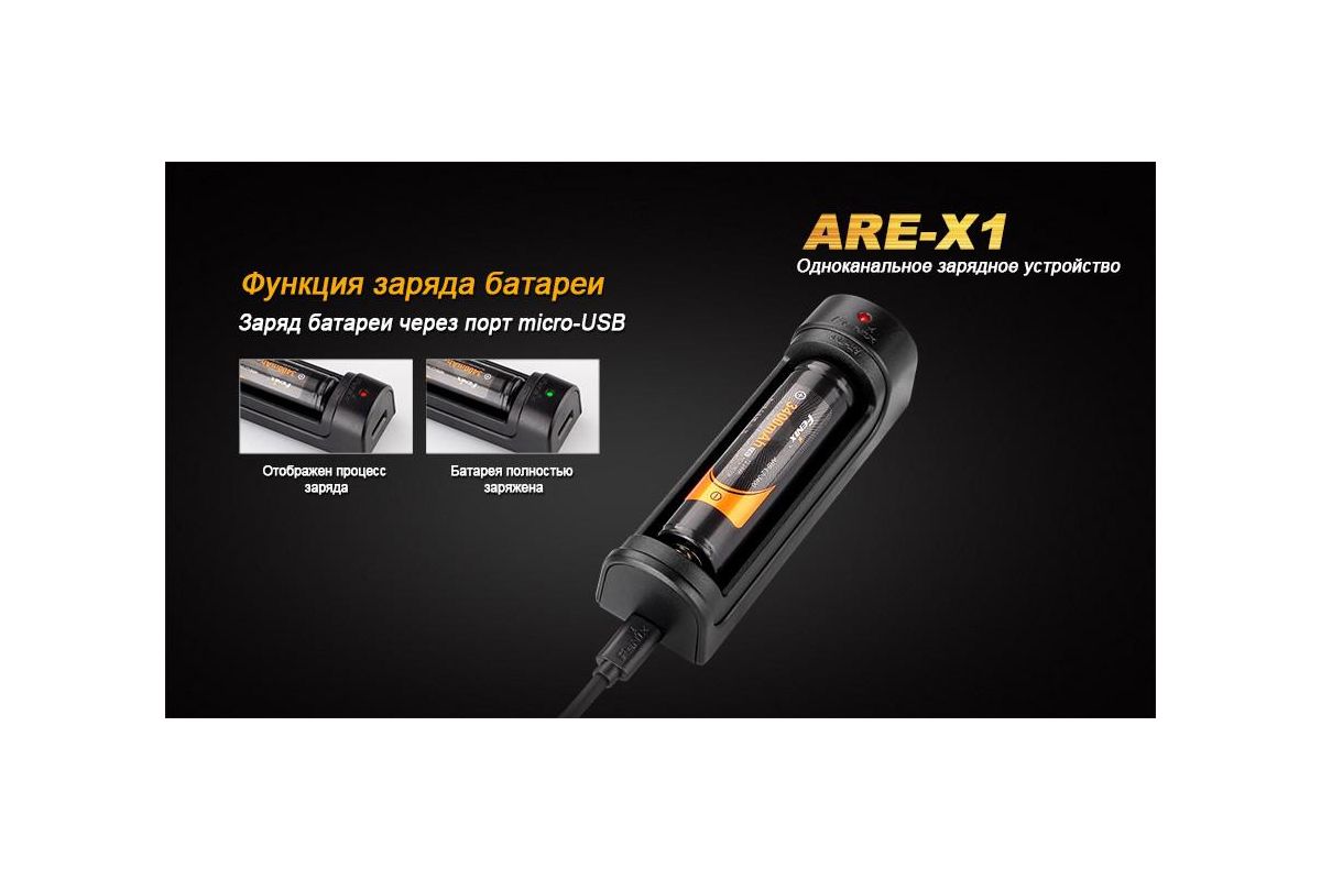 Fenix ARE-X1 (18650/26650) – маленькое, походного размера, зарядное устройство для зарядки (Li-ion) литий-ионного аккумулятора форм-фактора 18650 и 26650. В нём имеется два разъёма, USB и micro USB.