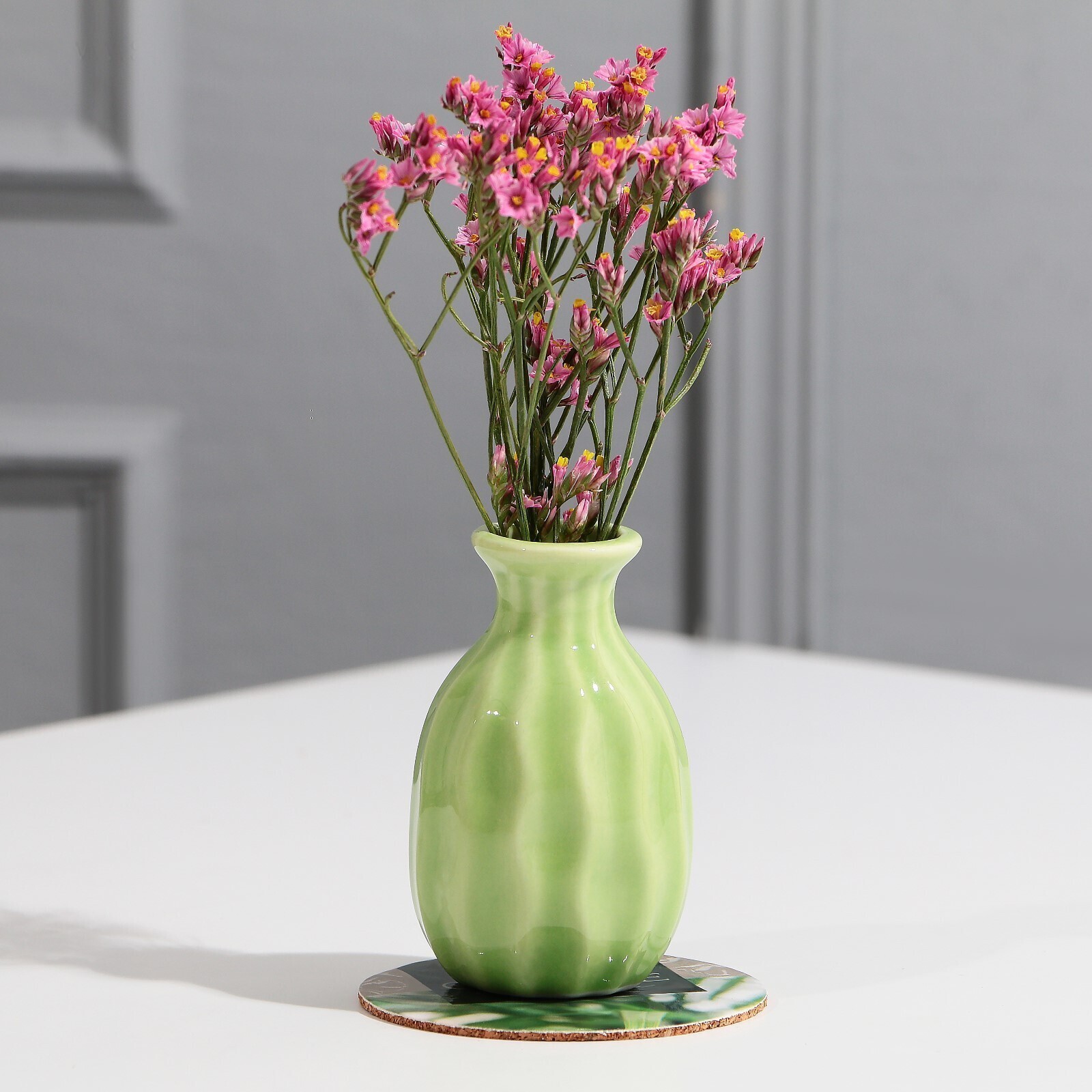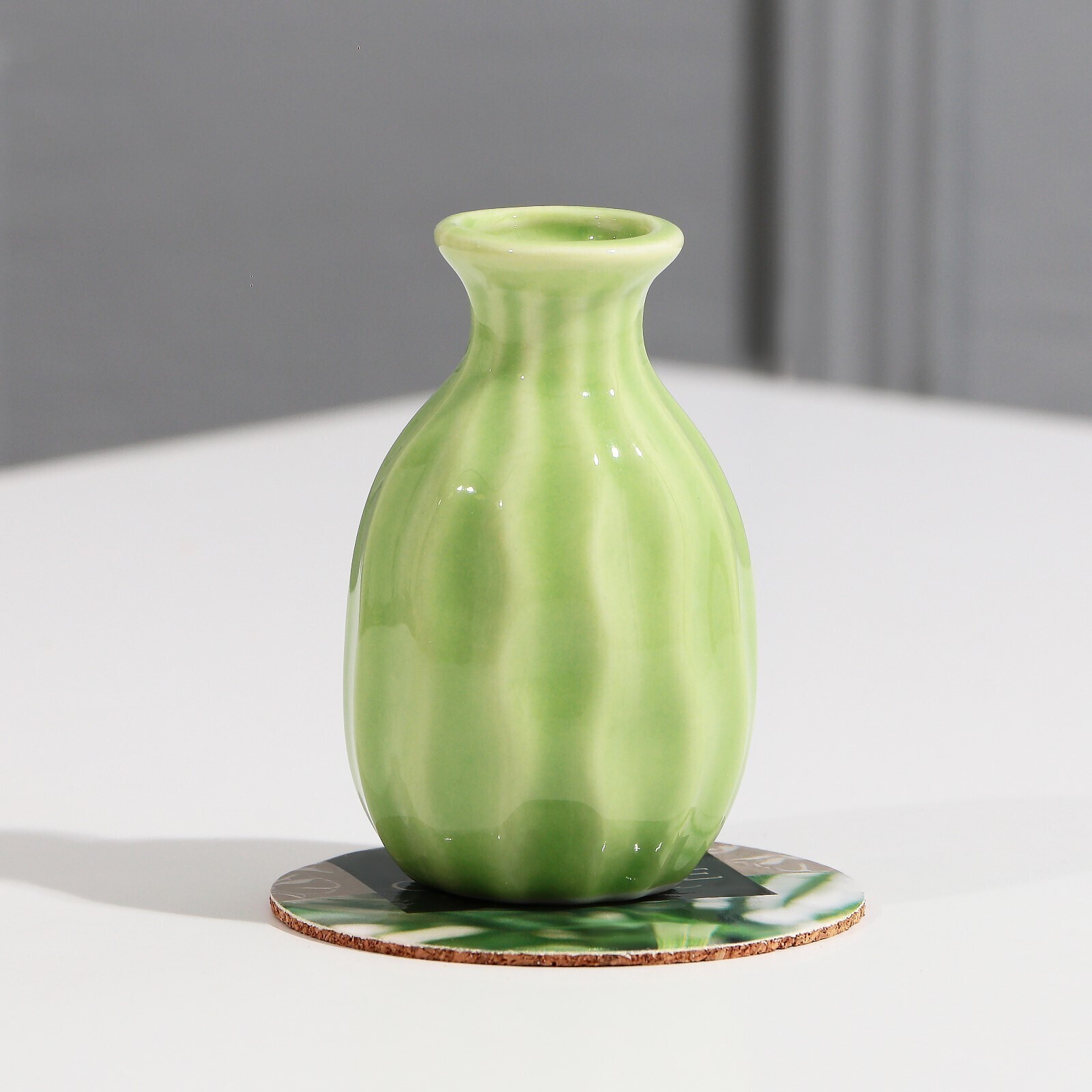 Декоративная ваза отлично дополнит любой букет или флористическую композицию. Так же, миниатюрная ваза, выполненная из керамики будет актуальна как самостоятельный предмет интерьера. В комплекте идет пробковая подставка с красивым рисунком, который отлично сочетается с самой вазой. Ваза-мини с подставкой - прекрасный подарок человеку со вкусом на любой праздник.