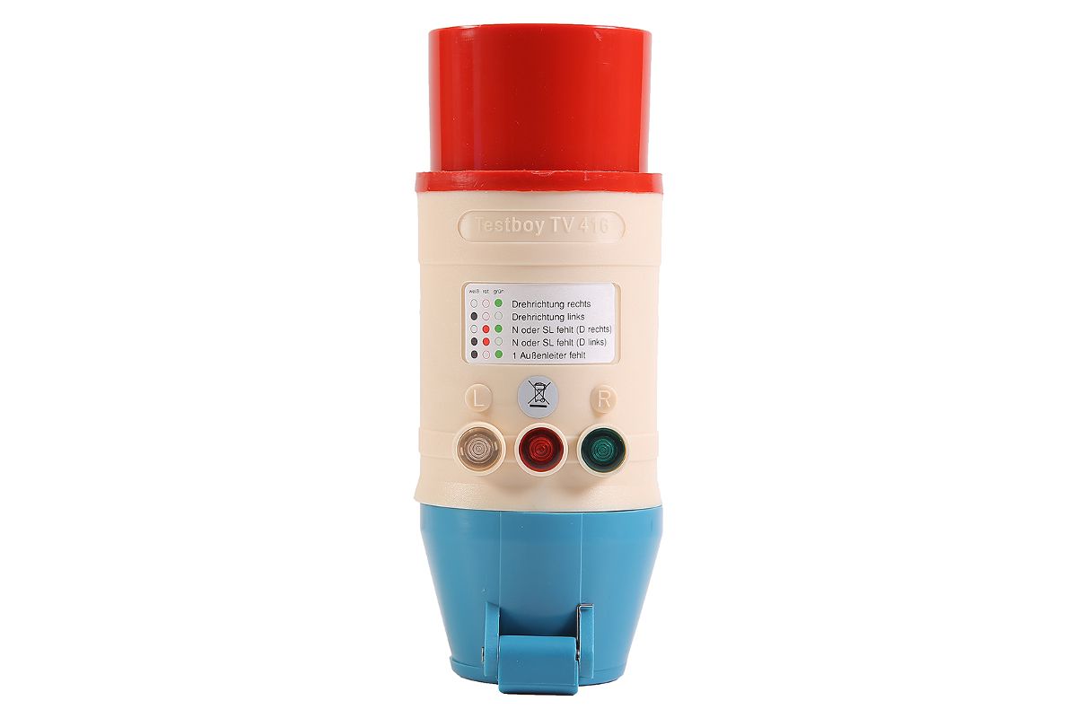 Устройство состоит из комбинации МЭК-штекера, розетки с заземляющим контактом и встроенной электроники для определения порядка чередования фаз. Встроенные сигнальные лампочки показывают или отсутствие проводников, или же их неправильное подсоединение. В комбинации с Testavit Schuki 1, 2, 2К или 3 можно протестировать электропроводку или устройства УЗО на их эффективность. Testboy TV 416 А существует в варианте для 32 А МЭК-розеток.
