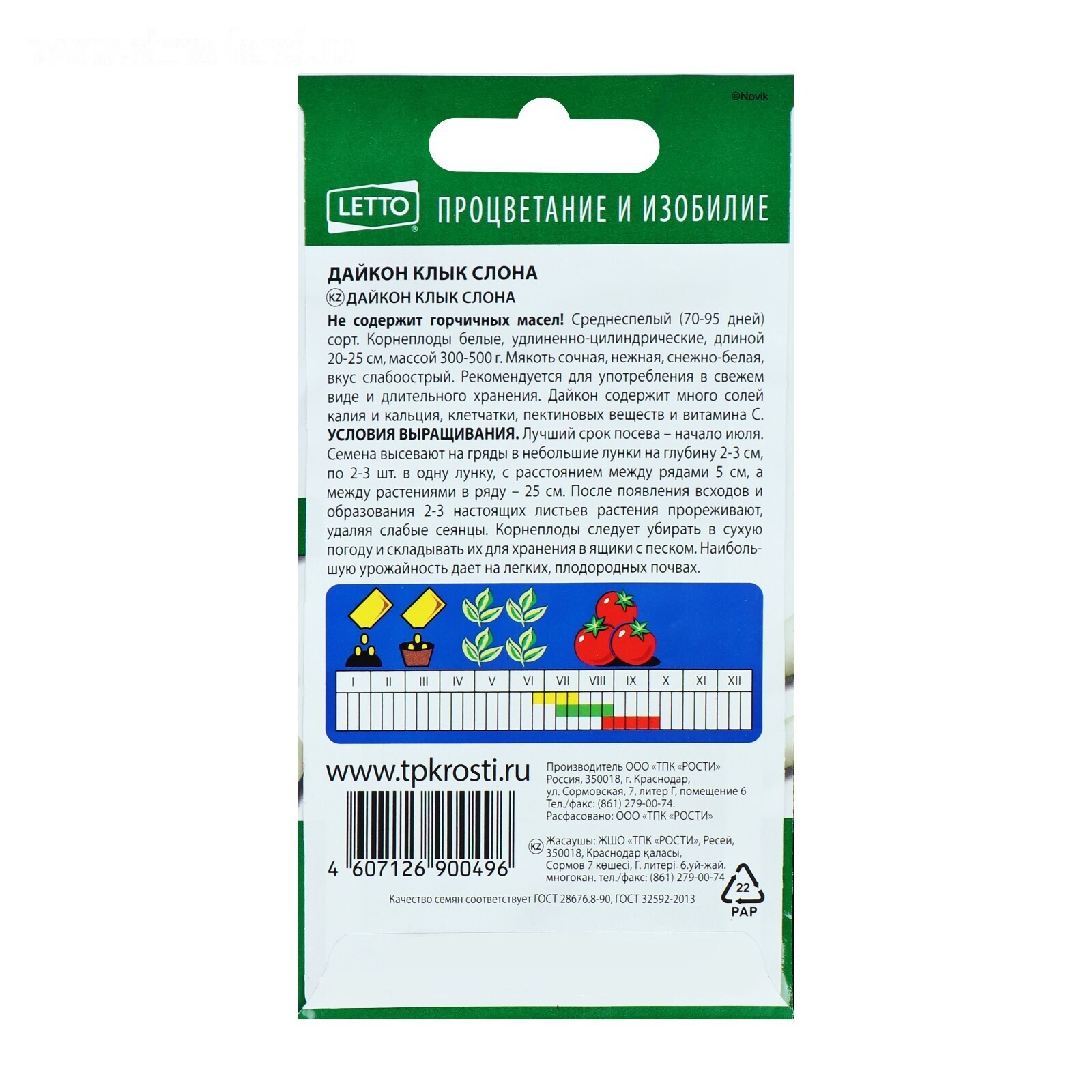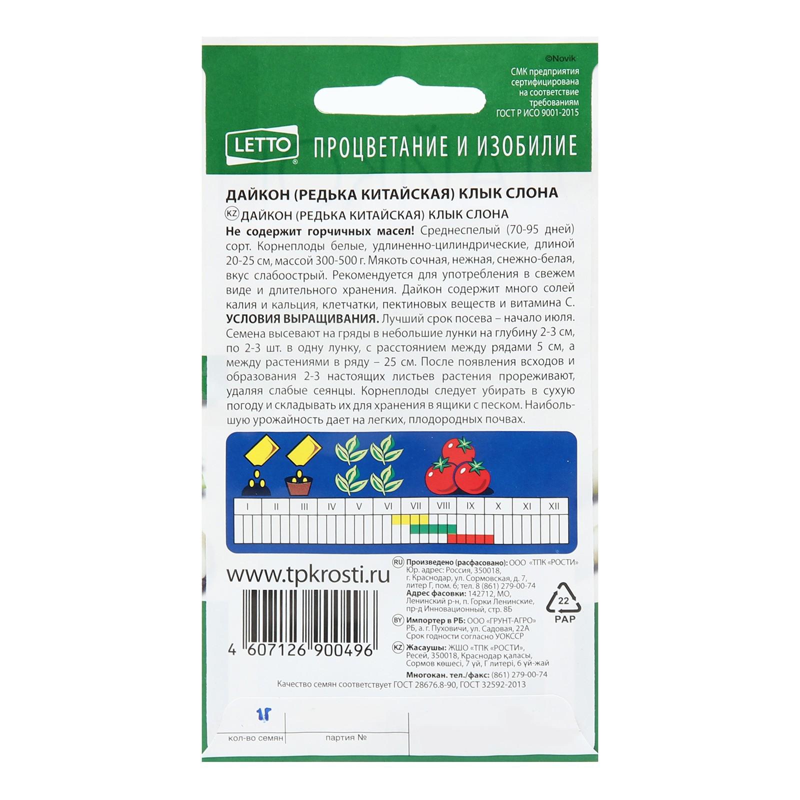 Корнеплод белый со светло-зеленой пигментацией, удлиненно-цилиндрической формы. Мякоть белая, у головки светло-зеленая, нежная, сочная, сладко-острого вкуса. Масса товарного корнеплода 315-540 г. Корнеплоды используют в свежем, вареном и соленом виде. Лечебные свойства - очищает печень и почки, растворяет камни.