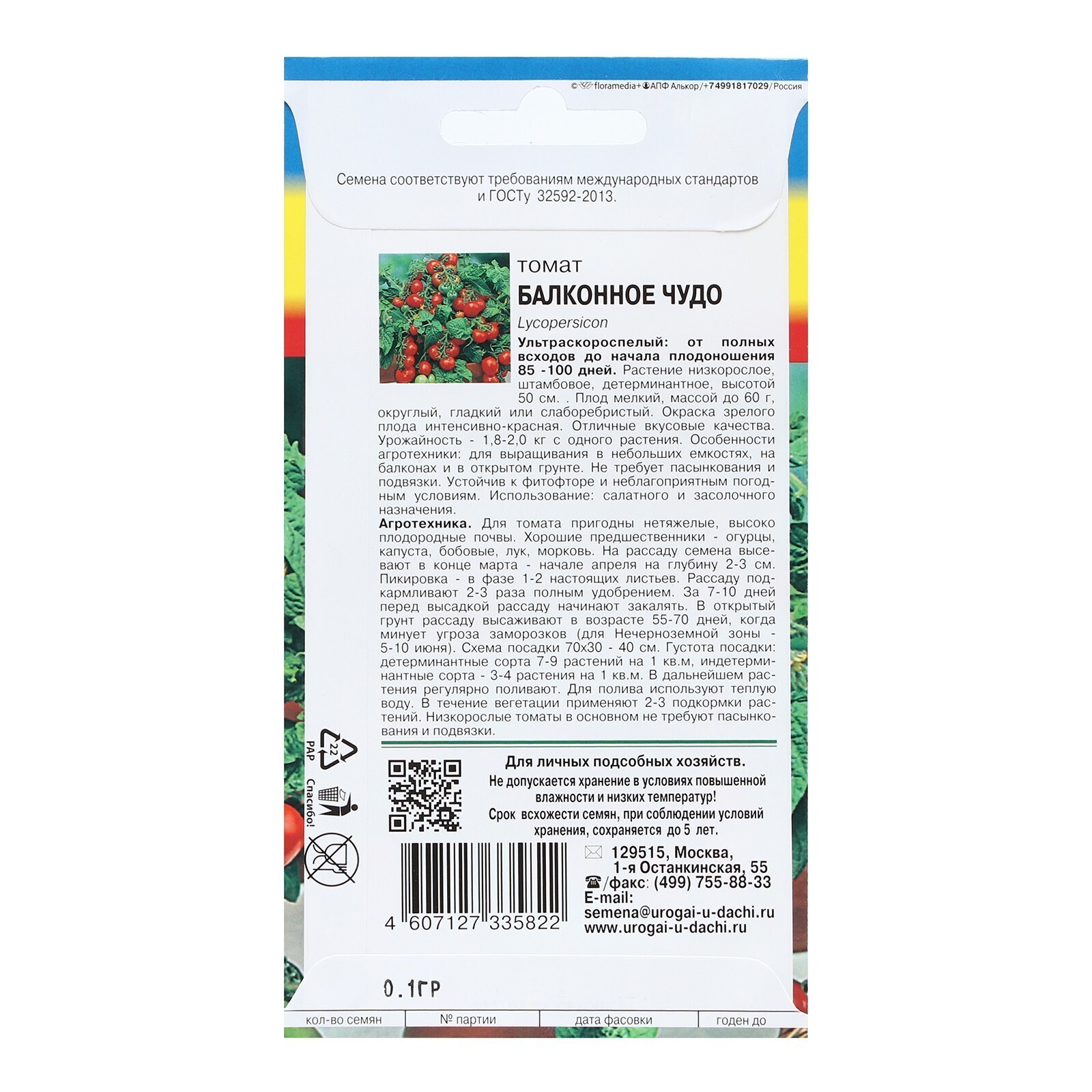 Ультраскороспелый: от полных всходов до начала плодоношения 85 -100 дней. Растение низкорослое, штамбовое, детерминантное, высотой 50 см. . Плод мелкий, массой до 60 г, округлый, гладкий или слаборебристый. Окраска зрелого плода интенсивно-красная. Отличные вкусовые качества. Урожайность - 1,8-2,0 кг с одного растения. Особенности агротехники: для выращивания в небольших емкостях, на балконах и в открытом грунте. Не требует пасынкования и подвязки. Устойчив к фитофторе и неблагоприятным погодным условиям. Использование: салатного и засолочного назначения.
