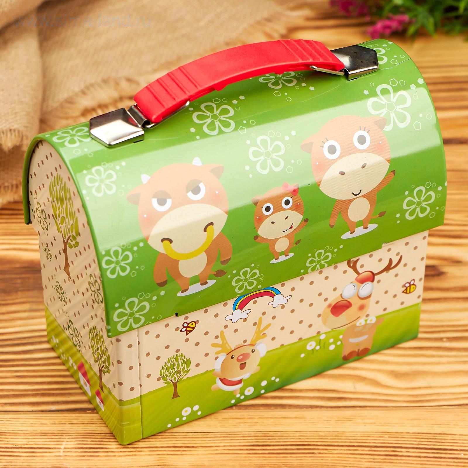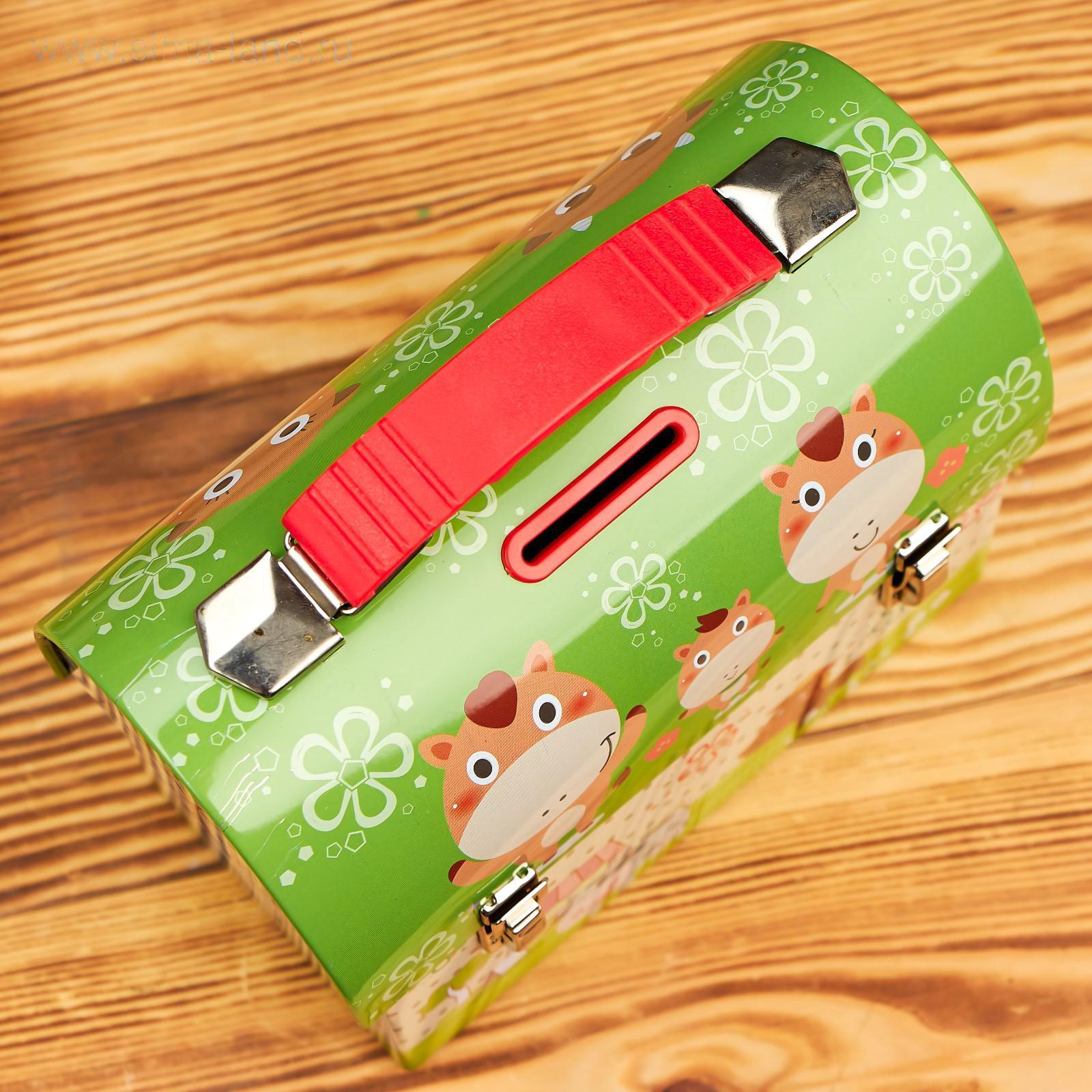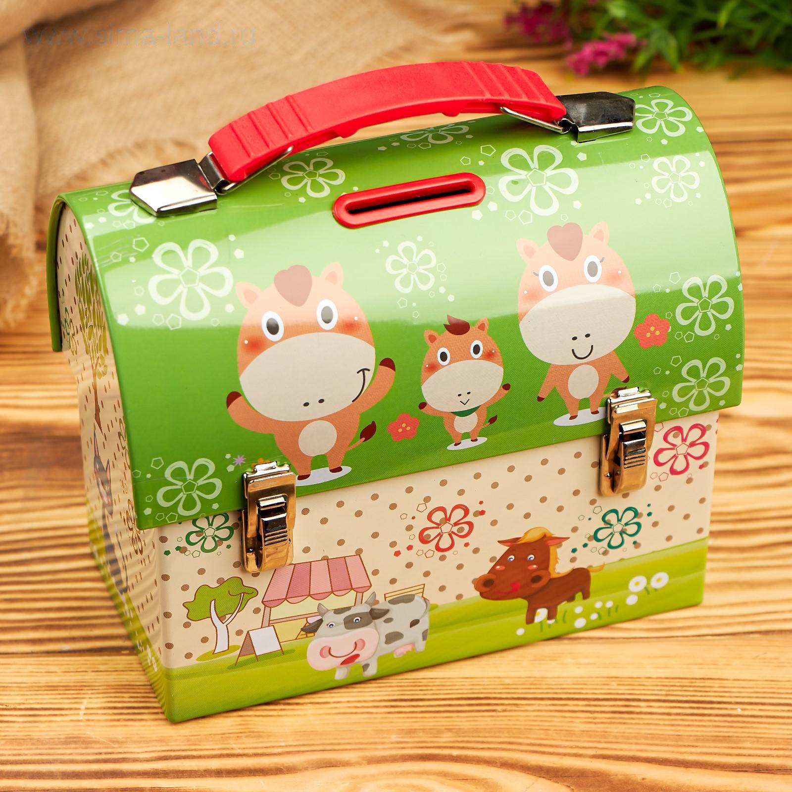 Копилка металл сундучок "Коровки и лошадки" 13х16х8,5 см