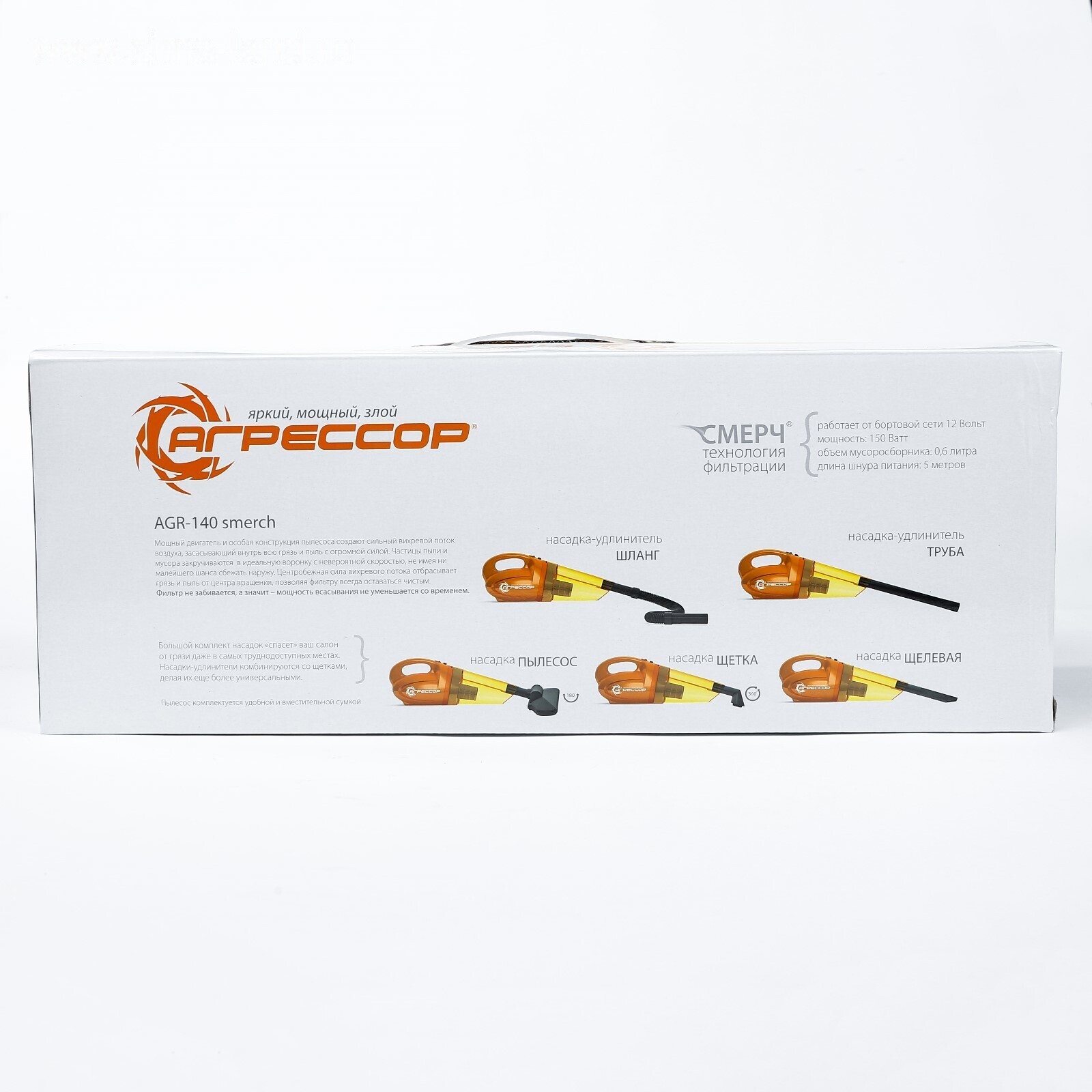 Пылесос автомобильный "Агрессор" AGR-140 Smerch, 12V, 150W, технология "Смерч", 5м шнур, 5 насадок, сумка