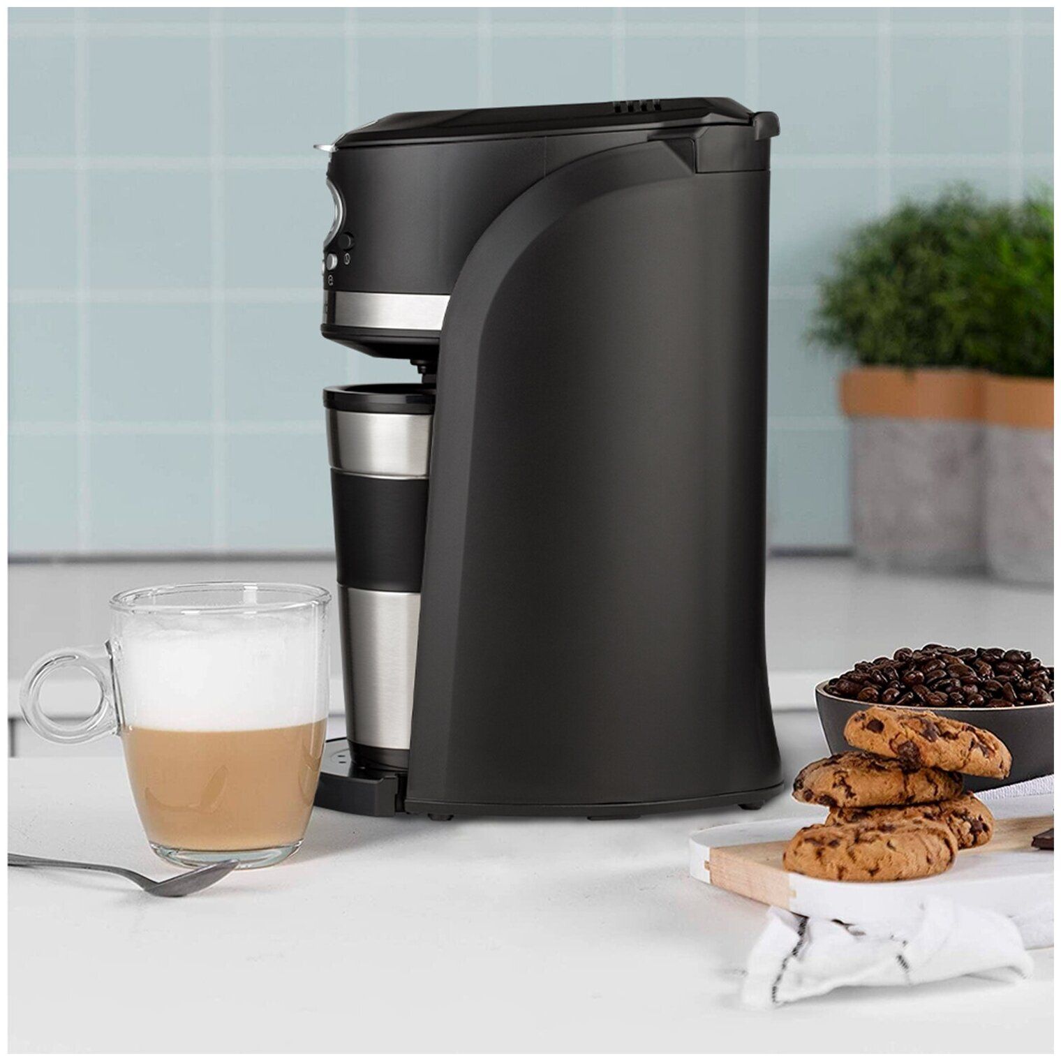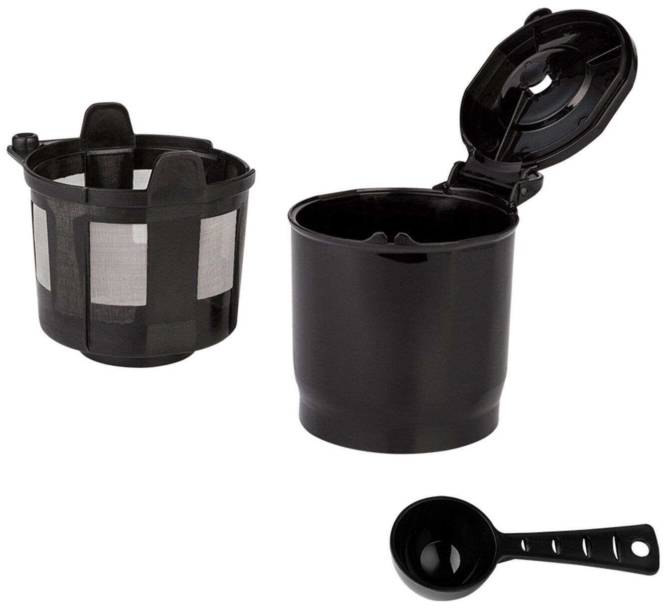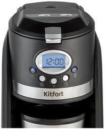 Капельная кофеварка КТ-797 готовит ароматный черный кофе одним нажатием кнопки. Встроенная кофемолка автоматически измельчает зёрна прямо в фильтре, кофеварка рассчитана на приготовление 1-3 чашек за 1 раз. Кофеварка КТ-797 оборудована дисплеем, который показывает текущее время и заданные настройки. Данная кофеварка имеет функцию отложенного старта. Также кофеварка оснащена прорезиненными ножками, которые предотвращают скольжение по столу. Термокружка выполнена из пластика и нержавеющей стали с силиконовой вставкой, которая не дает вам обжечься. Крышка термокружки позволяет пить кофе на ходу, благодаря удобной форме отверстия для питья, которое можно закрывать.