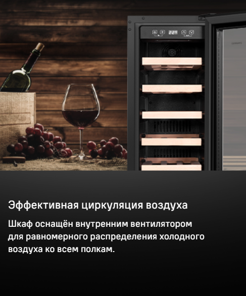 Шкаф оснащён внутренним вентилятором для равномерного распределения холодного воздуха ко всем полкам шкафа.