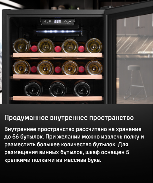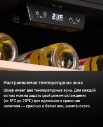 Изысканный дизайн модели делает её абсолютным выбором большинства: корпус выполнен из металла, окрашенной в чёрный цвет. Современная технология освещения зоны позволит вам в любое время эффектно продемонстрировать вашу винную коллекцию гостям. Каждая деталь модели гармонично дополняет друг друга, делая винный шкаф универсальным под любые стили интерьера. Дверца шкафа выполнена из тонированного стекла с защитой от УФ лучей.
