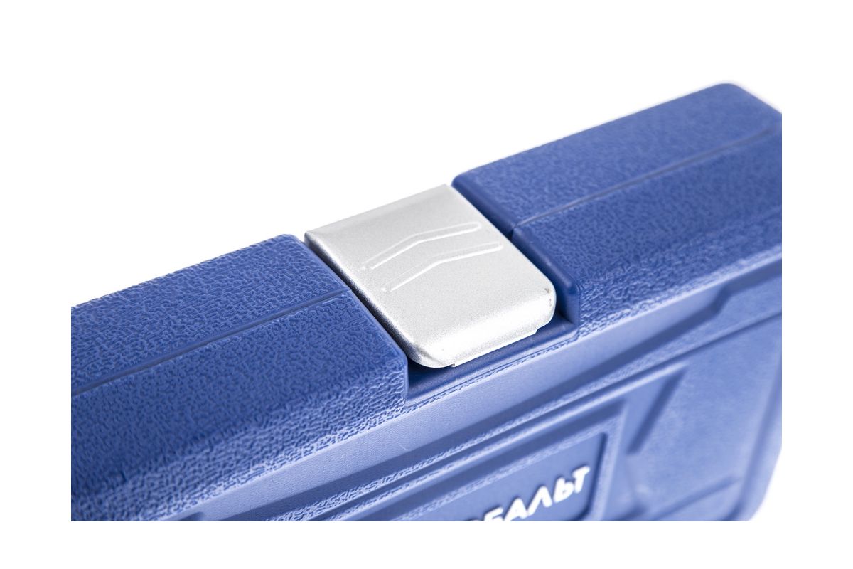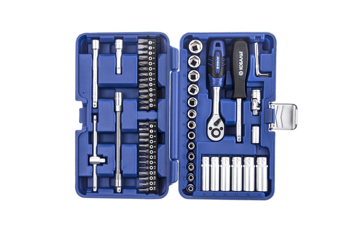 КОБАЛЬТ 010101-56 — это универсальный набор ручных для работы в доме и гараже. 56 предметов поставляются в противоударном пластиковом кейсе. Основную часть составляют торцевые головки. Их дополняют удлинители, держатели, торцевые ключи, биты и не только. Вес кейса вместе с инструментами — 1,35 кг.