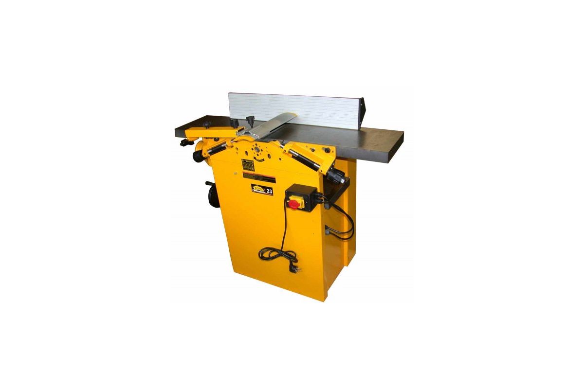 Комбинированный настольный станок ЭНКОР Корвет-23 совмещает в себе функции строгального и рейсмусового станков. Инструмент оборудован асинхронным двигателем мощностью 1100 Вт. Рабочий вал с тремя ножами вращается со скоростью 4000 об/мин. Заготовка подается автоматически. Направляющая планка изменяет угол наклона в пределах 45о.