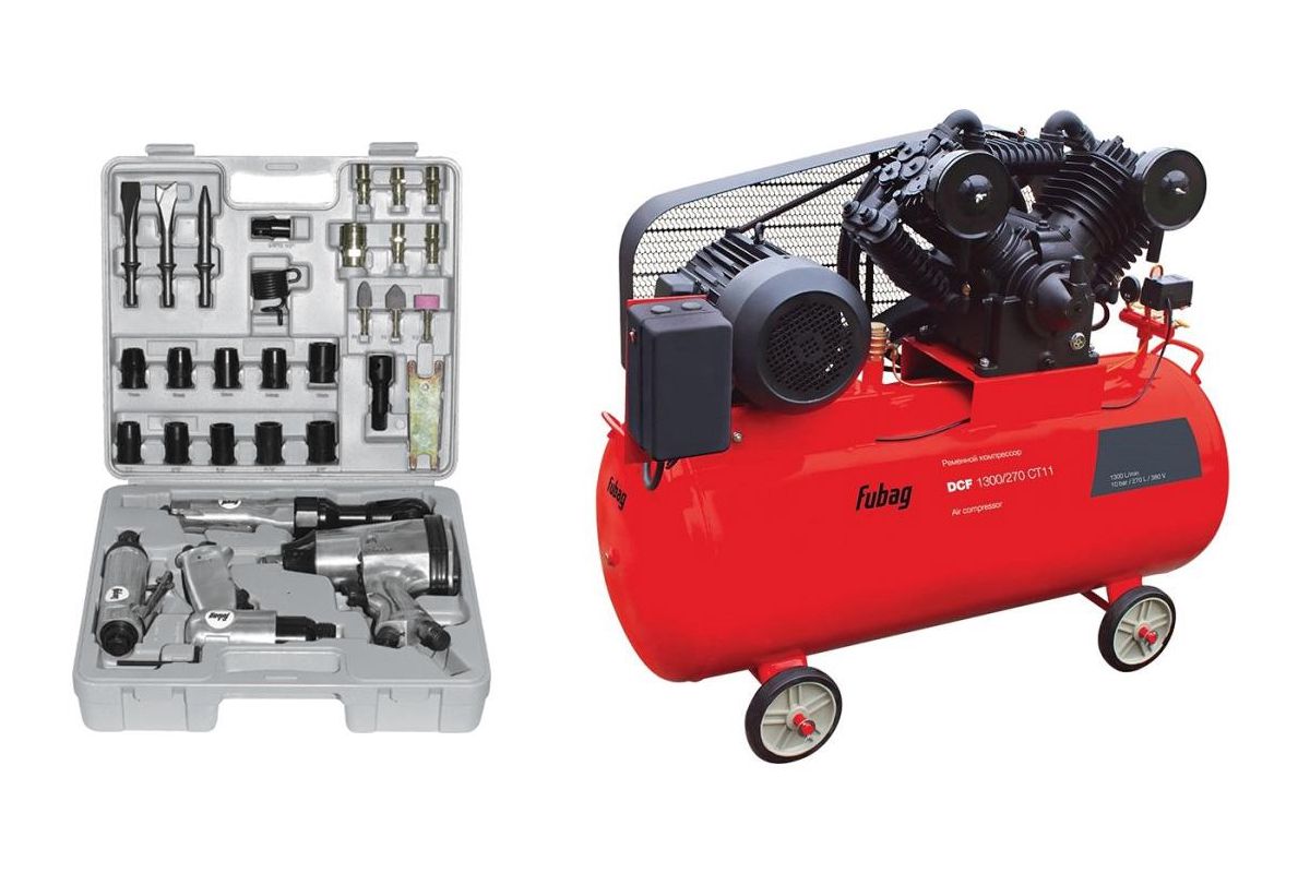 В состав набора входят: Компрессор FUBAG DCF-1300/270 CT11 поршневой масляный, 7500 Вт, 1300л/мин, 10бар, Набор пневмоинструмента FUBAG 120103 34 предмета кейс