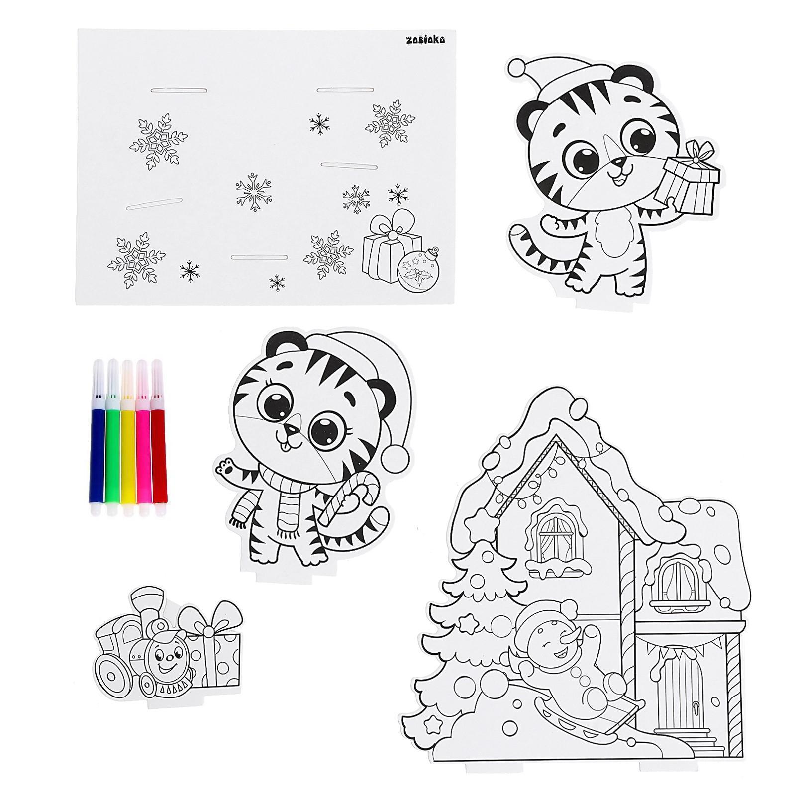 Из 5 деталей малыш соберёт новогодний конструктор и оживит его яркими цветами. Для сборки не требуется клей. Новогодняя раскраска из картона подойдёт в качестве подарка для ребёнка.