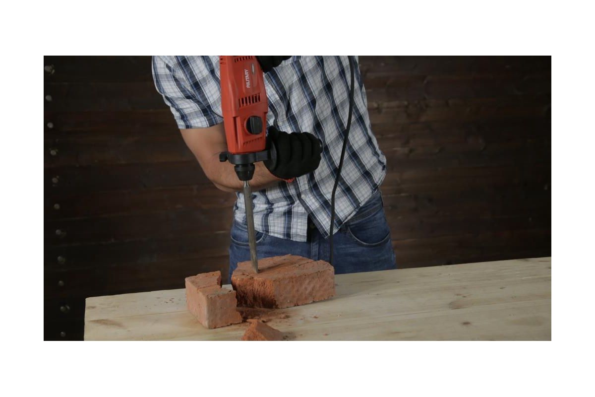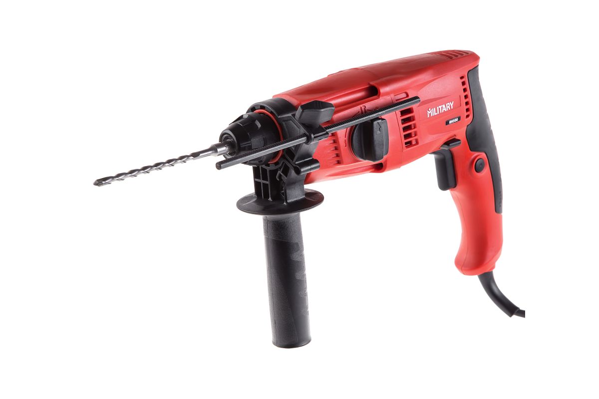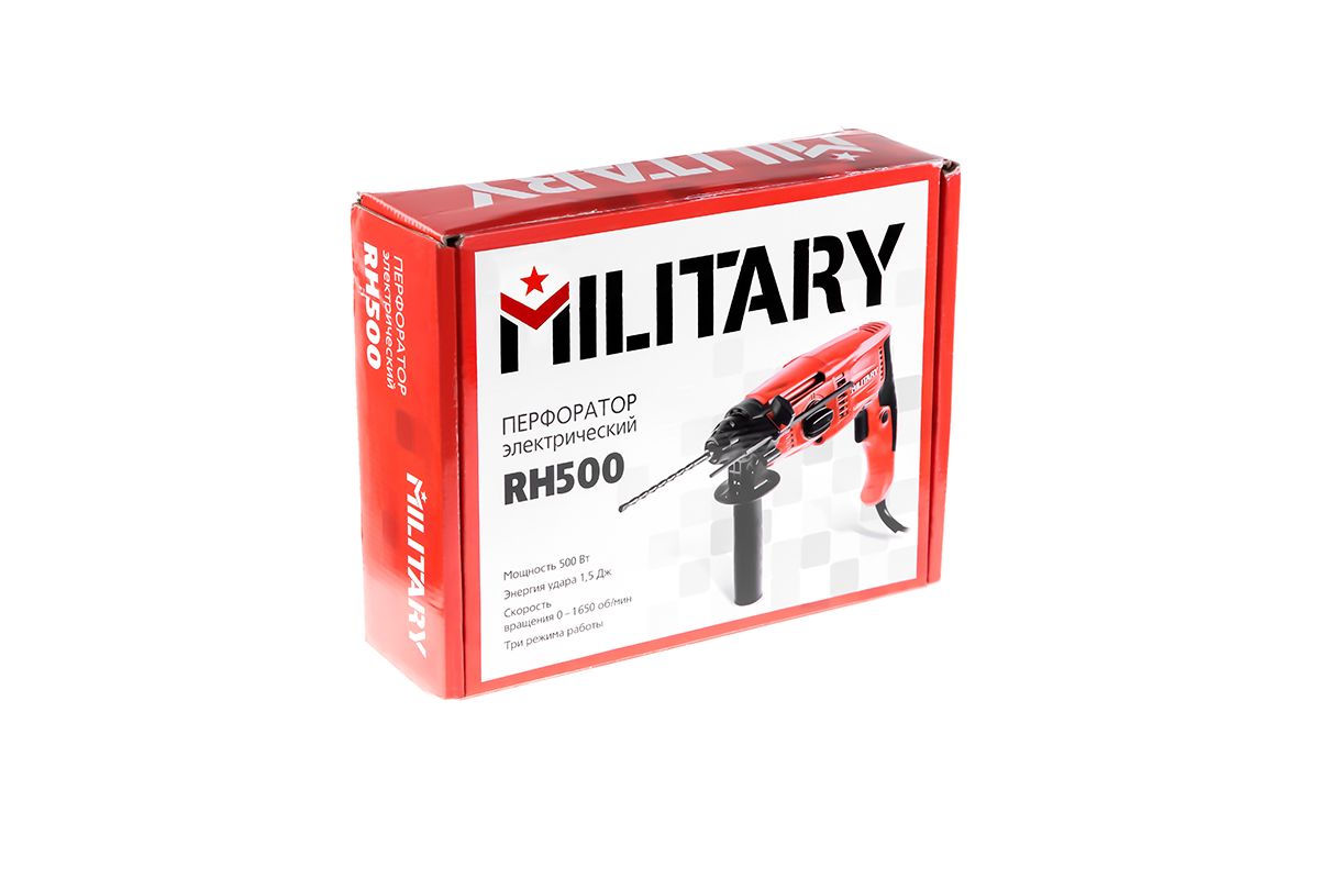 MILITARY RH500 – трехрежимный перфоратор для домашнего ремонта. Сверлит камень, кирпич, дерево и металл, выдалбливает бетон. Вместе с оснасткой весит не более 2 кг.