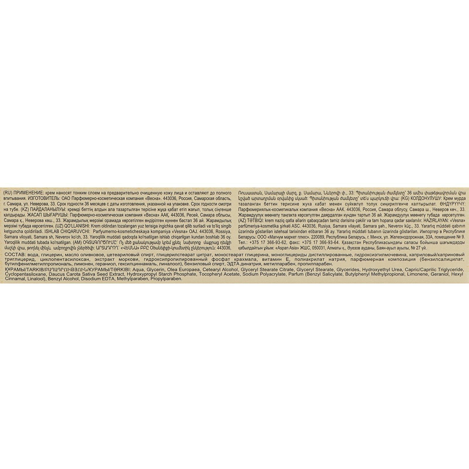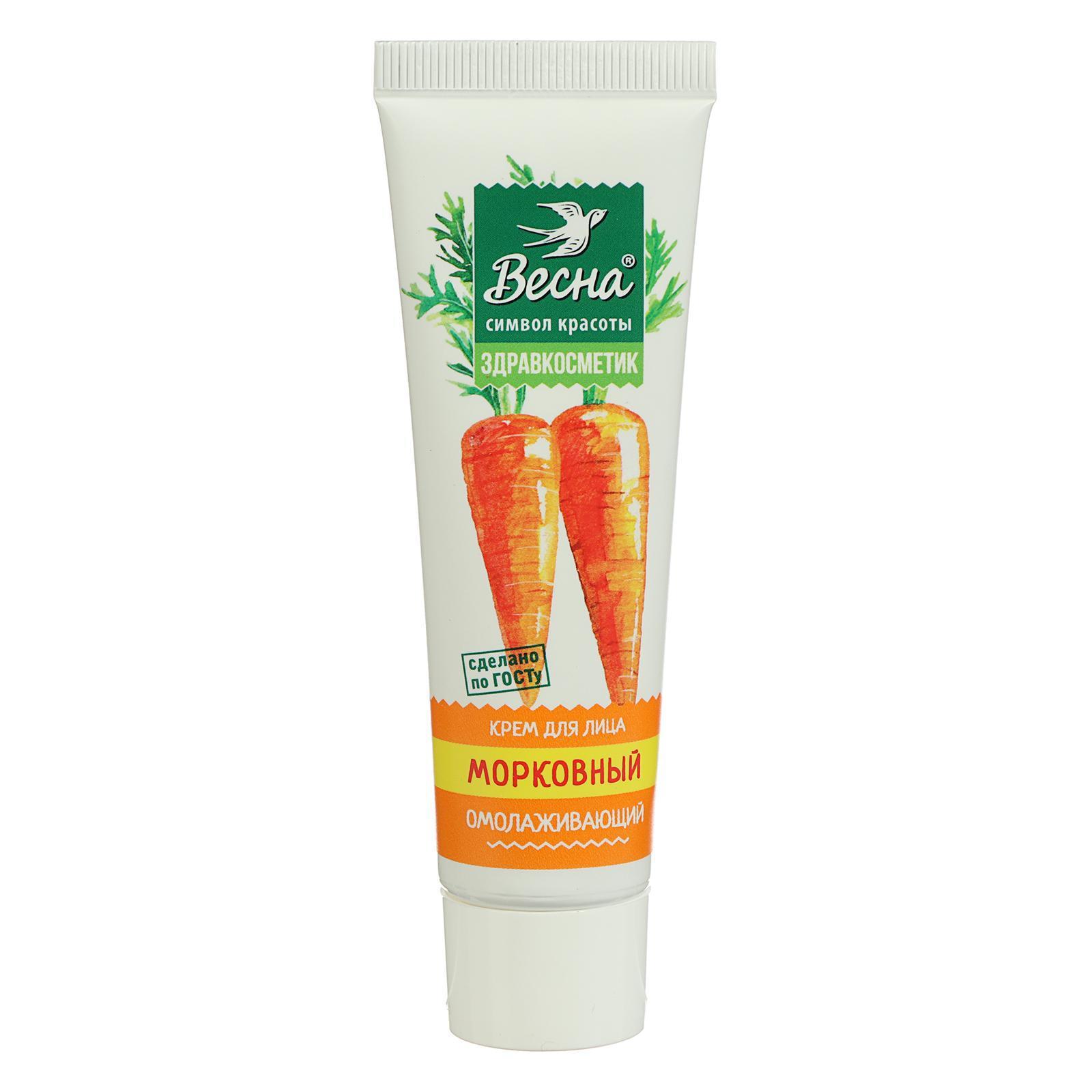 Крем для лица Весна Морковный омолаживающий, наполняет кожу жизненной энергией, устраняет сухость и шелушение, повышают гладкость кожи. Крем подходит для ежедневного применения. Входящие в состав крема для лица экстракт сока Моркови, Б-каротин и специально подобранный комплекс смягчают и тонизируют кожу лица, способствуют поддержанию в норме воднолипидного баланса. Цвет лица улучшается, снижается покраснение кожи. В состав крема для лица омолаживающий входят компоненты: экстракт моркови, витамин Е, оливковое масло, гидрованс, косметическая формула крахмала. Крем для лица призван питать, увлажнять и матировать кожу лица. Крем для лица омолаживающий белого цвета, с легким растительным ароматом, довольно густой, нежный, нежирный. Крем для лица легко наносится, практически мгновенно впитывается, не липнет, не скатывается. Крем подходит для любого типа кожи.