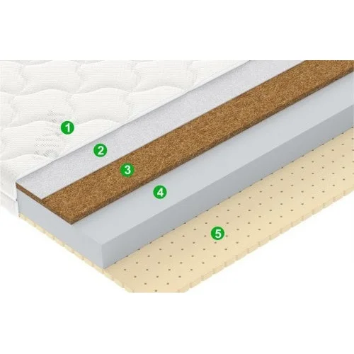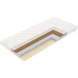 Среднежёсткий, средний, ширина 60 см, длина 120 см, высота 10 см, базовый блок - беспружинный, настилочные материалы - латекс. Пенополиуретан (поролон): холлкон. Кокосовая койра: 2 слоя., чехол Съёмный чехол. Тип ткани чехла: поликоттон. Стёганый чехол.