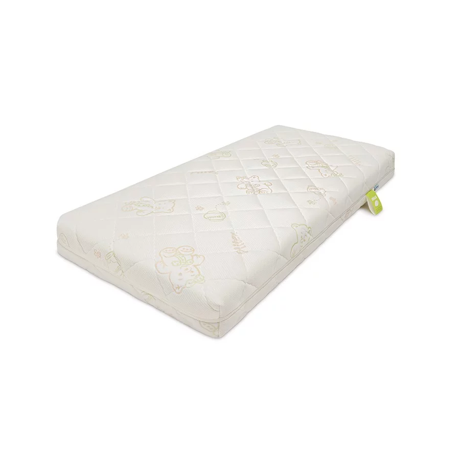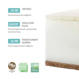 Среднемягкий, средний, ширина 60 см, длина 119 см, высота 12 см, базовый блок - беспружинный, настилочные материалы - латекс: 10 мм, Кокосовая койра: 10 мм, Синтепон: (Airotek), чехол Съёмный чехол, Тип ткани чехла: трикотаж (джерси), Стёганый чехол.