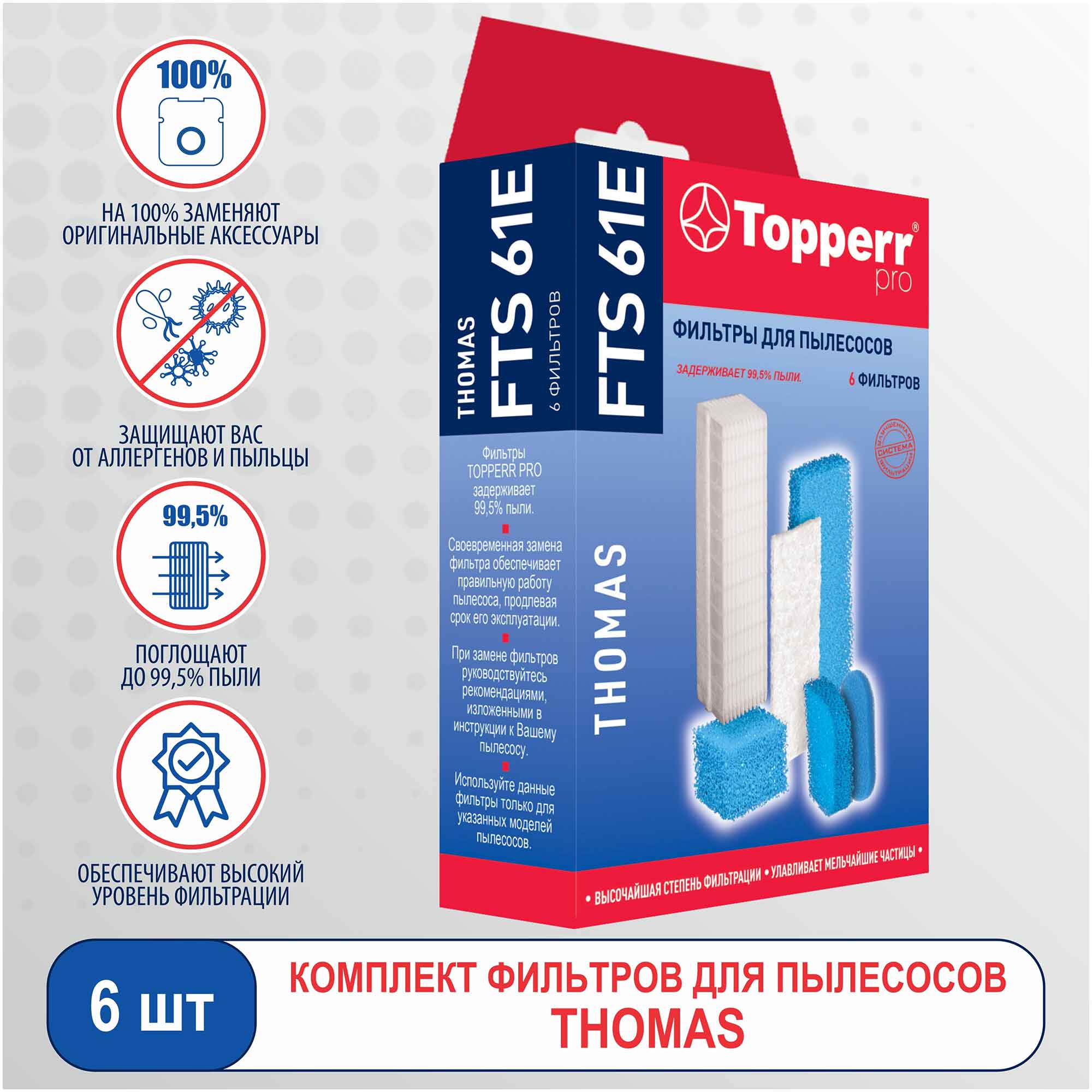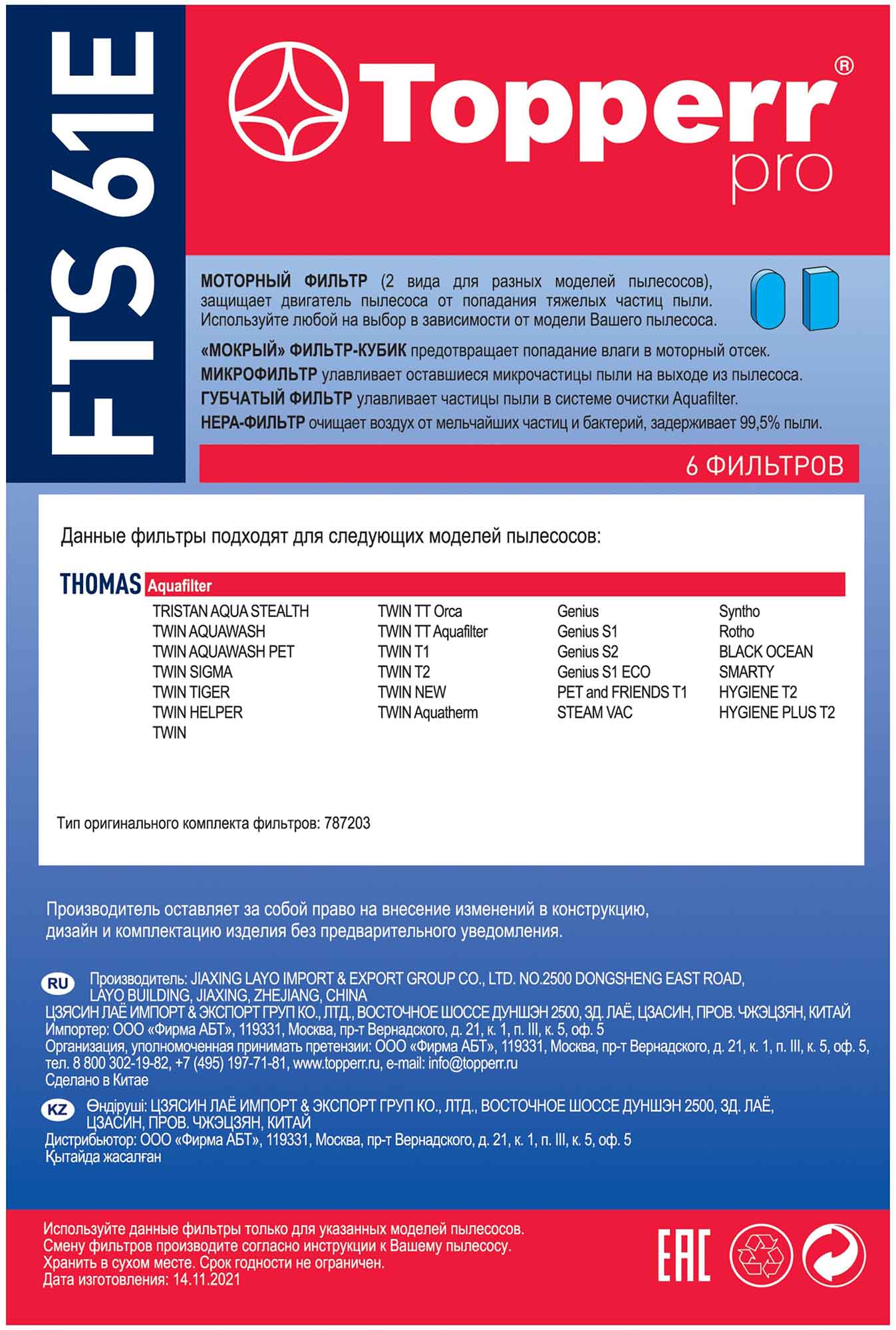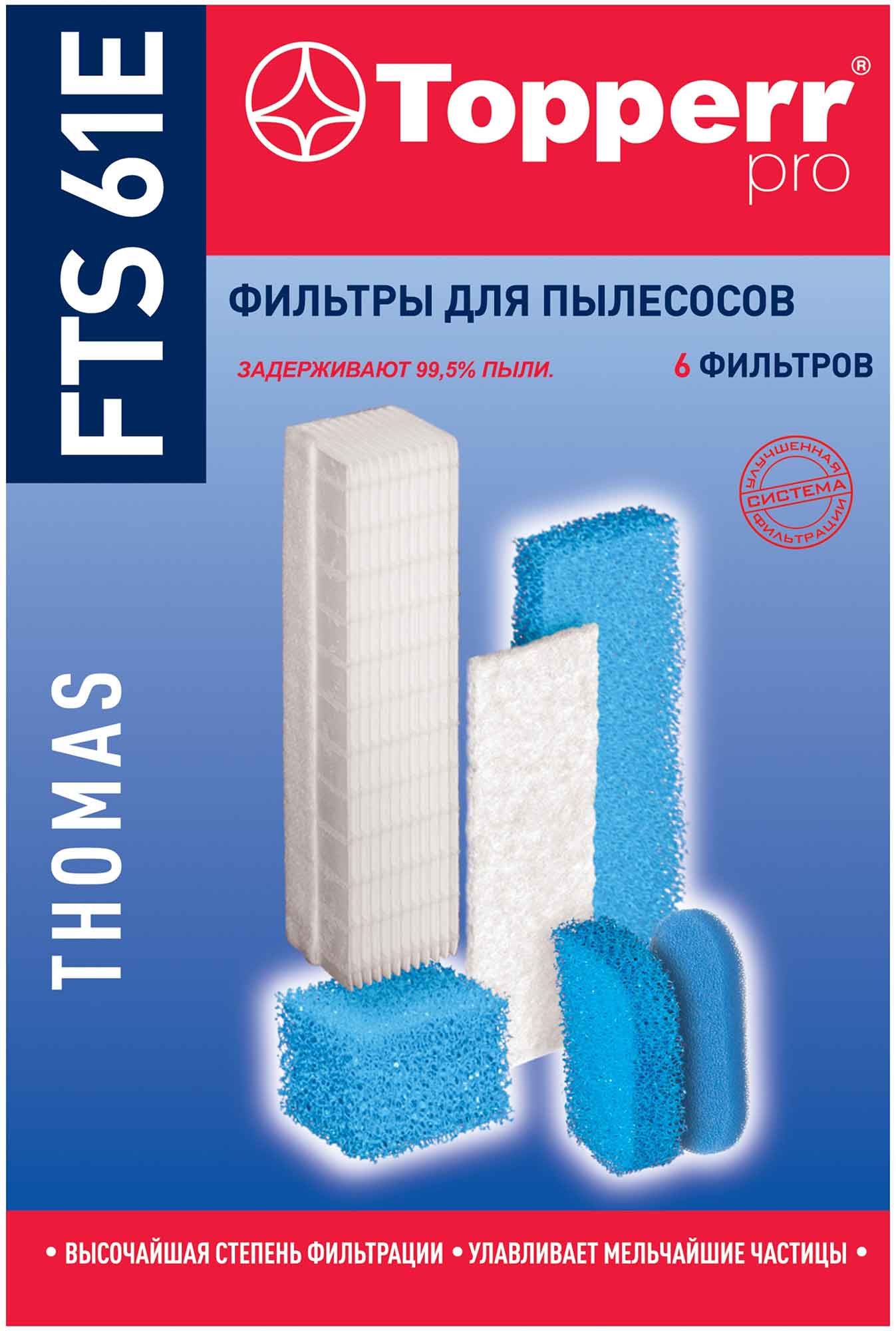 Набор фильтров FTS 61 для моющих пылесосов Thomas. В наборе 6 предметов: моторный фильтр (2 вида для разных моделей пылесосов), мокрый фильтр-кубик, микрофильтр, губчатый фильтр, НЕРА-фильтр.