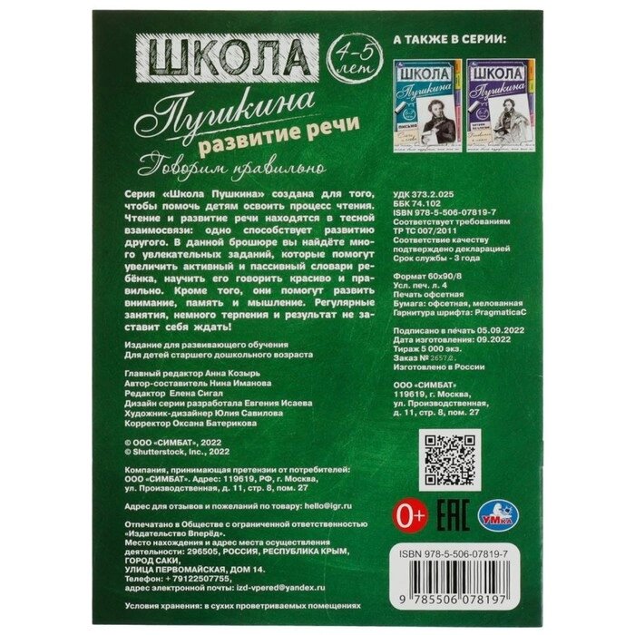 Развитие речи. Говорим правильно. 4-5 лет Школа Пушкина. 32 стр. Умка. вкор. 30шт