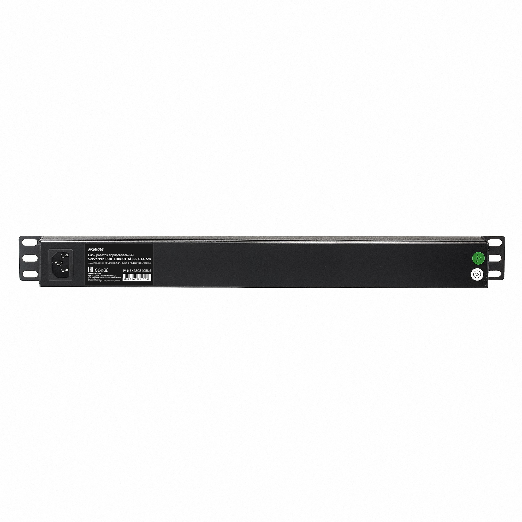 Блок розеток с выключателем с подсветкой и разъемом подключения C14 ExeGate ServerPro PDU-19H801 Al-8S-C14-SW (19", 1U, Алюминий, 8 Schuko, C14, выкл. с подсветкой, черный, RTL)