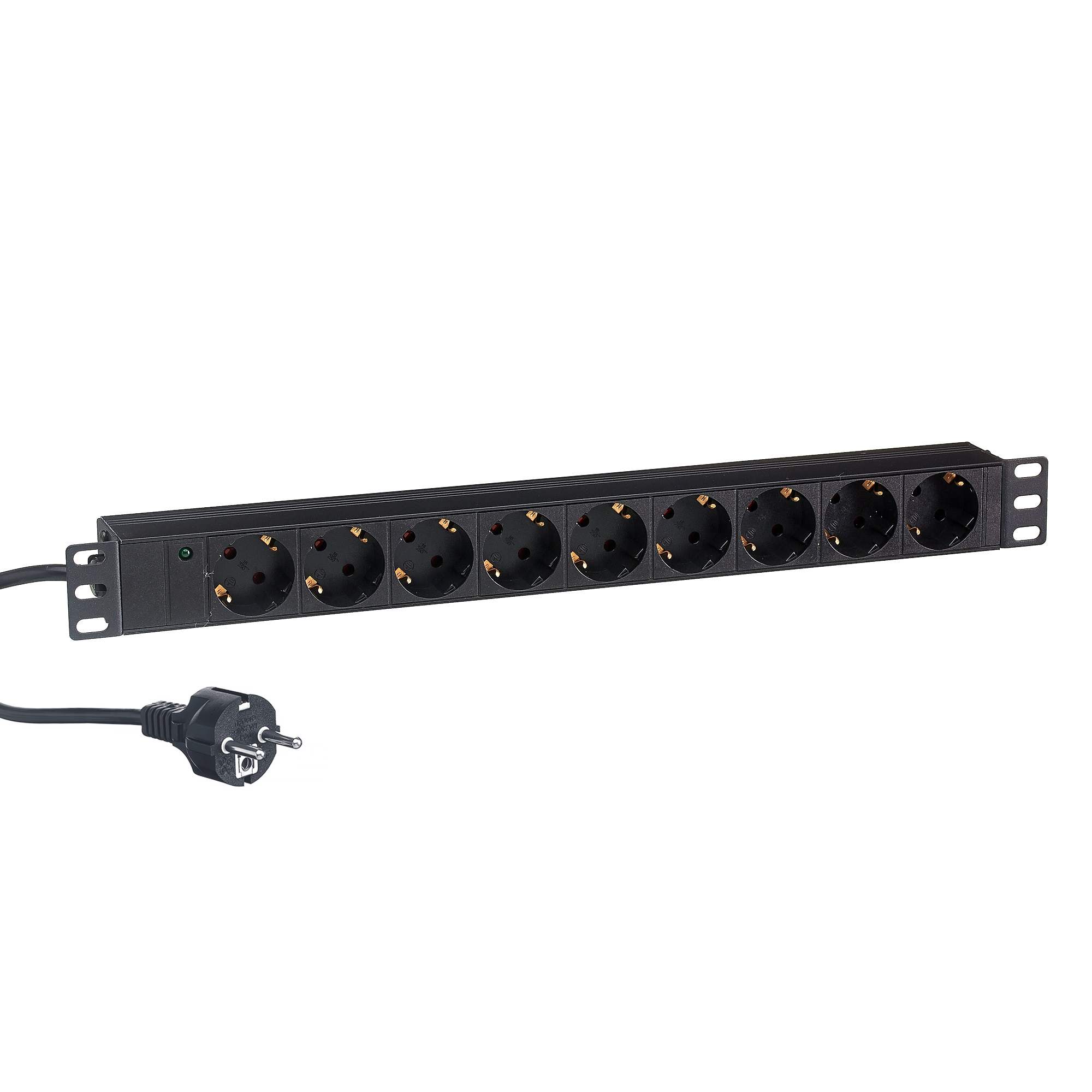 Блок розеток горизонтальный ExeGate ServerPro PDU-19H904 Al-9S-EU2.5CU (19", 1U, Алюминий, 9 Schuko, кабель с евровилкой VDE-250V-16A-3*1.5mm2, 2.5 метра, черный, RTL)