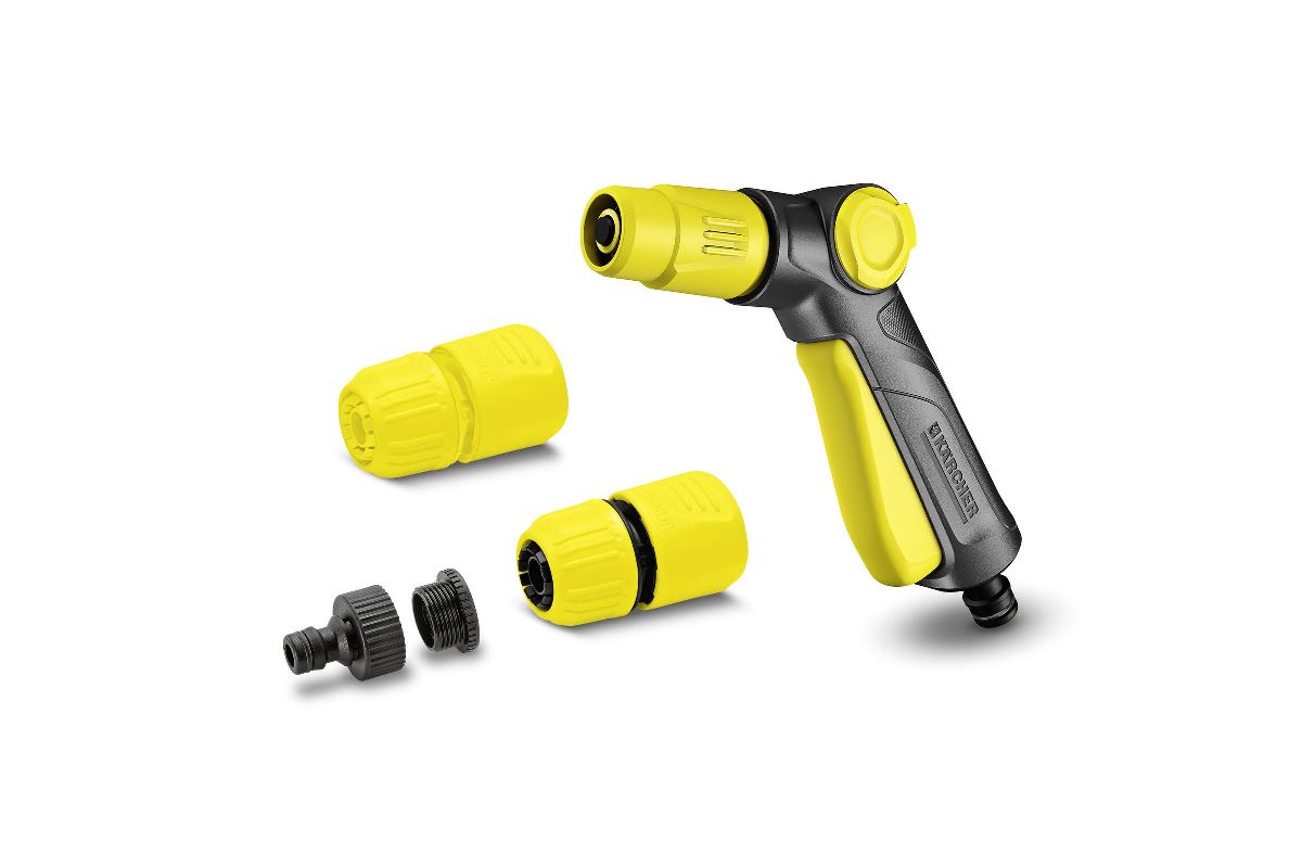 Один комплект со всем необходимым для удобного полива сада. Пистолет-распылитель (арт. 2.645-265.0)с простой фиксацией рычага для непрерывного полива. Плавная регулировка формы струи (от точечной до конической). Удобная регулировка расхода воды одной рукой (мин. – макс.) Легко поливать клумбы, грядки, кустарники или можно очищать садовую мебель и инструмент от грязи. Пистолет подходит для любых задач. В дополнение к пистолету, комплект содержит штуцер для крана G 3/4'' с переходником G1/2'', а также 2 надежных коннектора 1/2'' - один из которых с функцией аквастоп. Это предотвращает течь воды на конце шланга, при отсоединении пистолета. Все распылители Karcher совместимы с распространенными на рынке системами стыкового соединения.