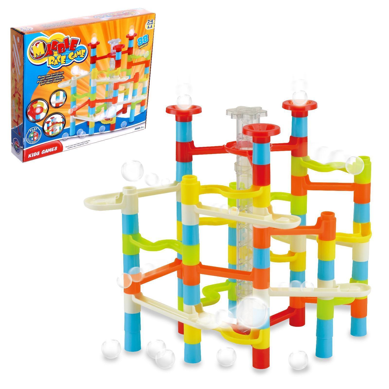 Соберите лабиринт из ярких цветных деталей разных форм и размеров, а затем запускайте по нему шарики. В компании друзей можно устраивать соревнования: кто быстрее достигнет финиша.