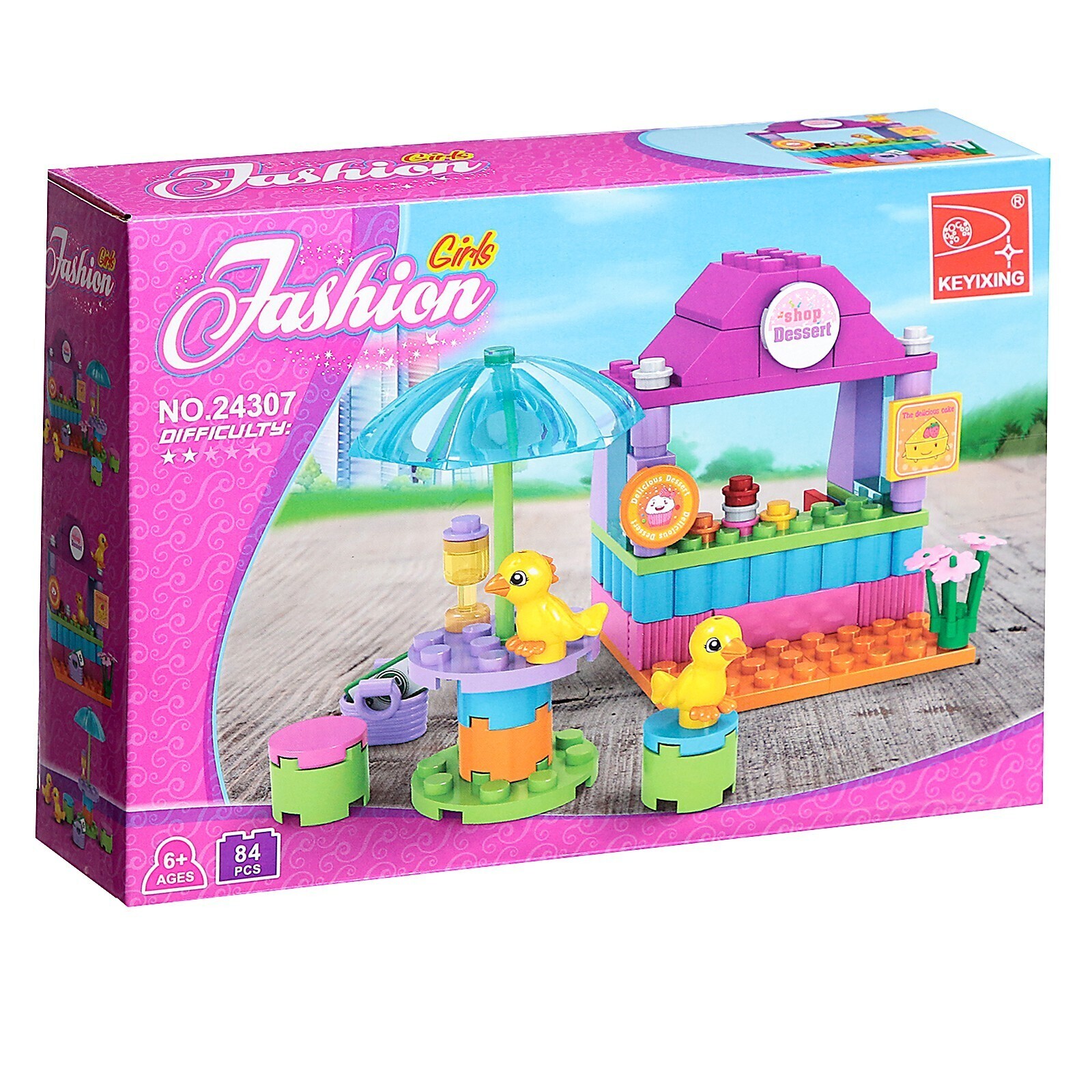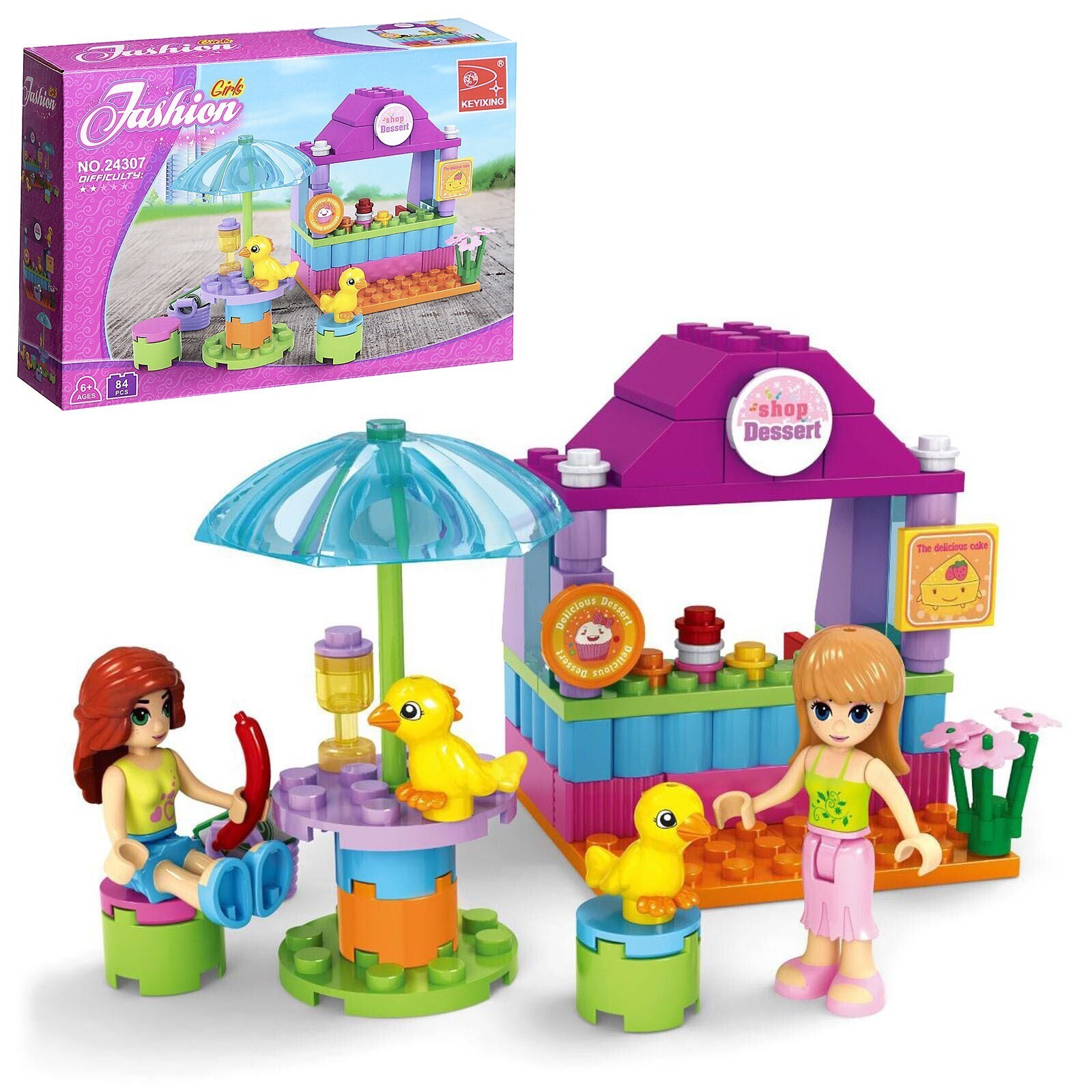 Набор содержит 84 детали и позволяет сконструировать буфет, обеденную зону, продукты и фигурки посетителей.