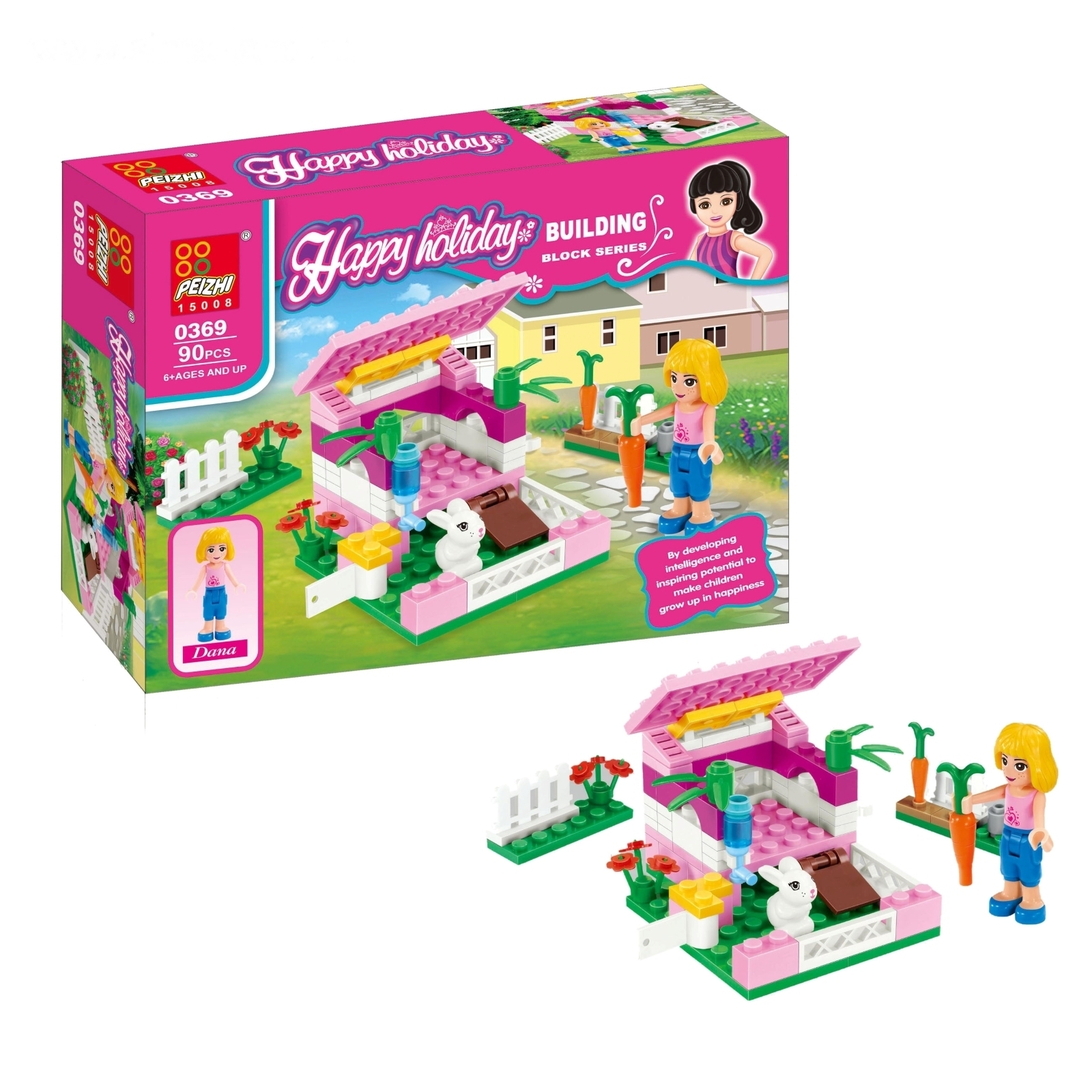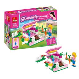 Красочные детали набора пробудят воображение ребёнка и подарят множество идей для игровых сюжетов. Из 90 элементов малышка соберёт садовый участок, где станет выращивать цветы и овощи и заботиться о кролике. Для пушистого любимца юная хозяюшка построит вольер с кормушкой и поильником.