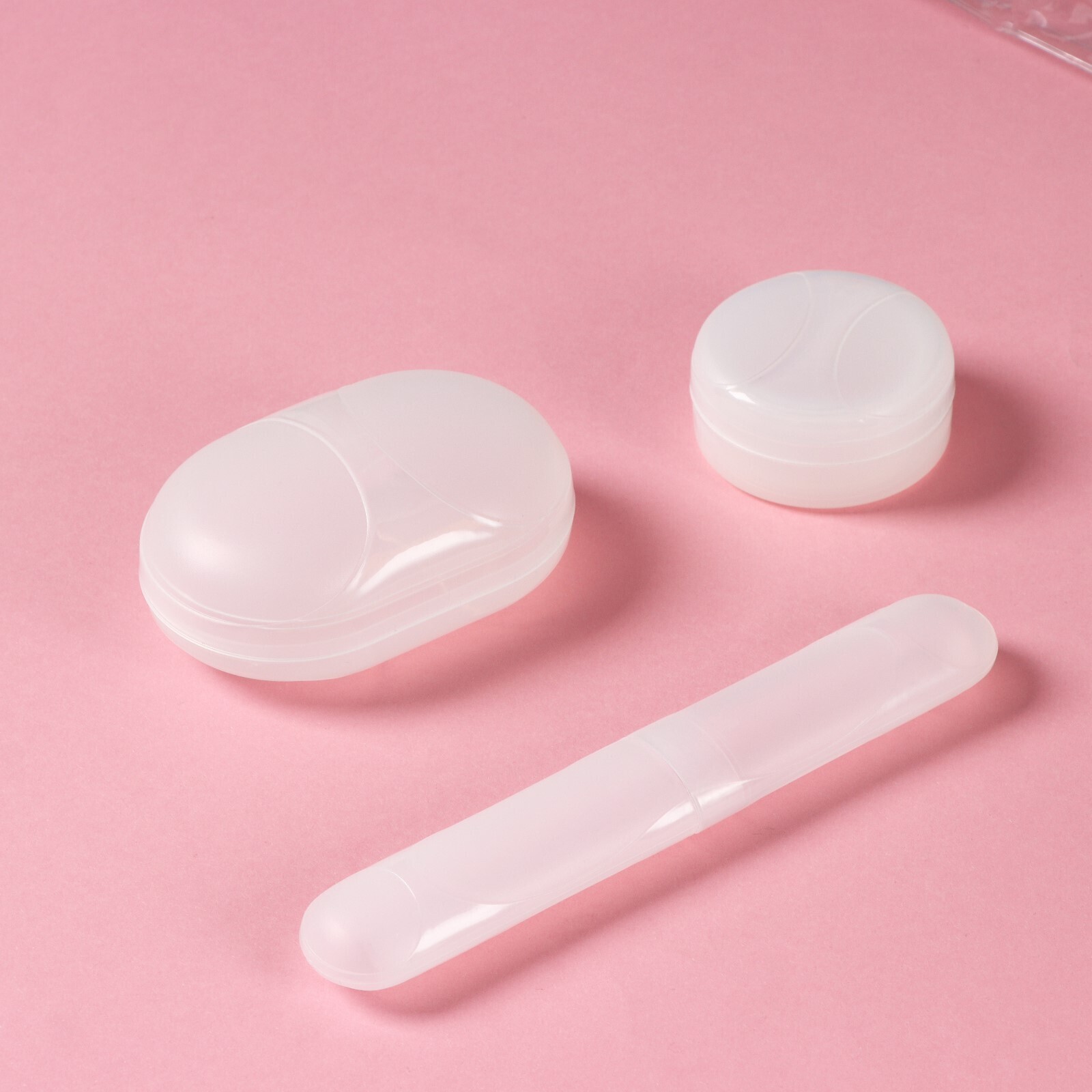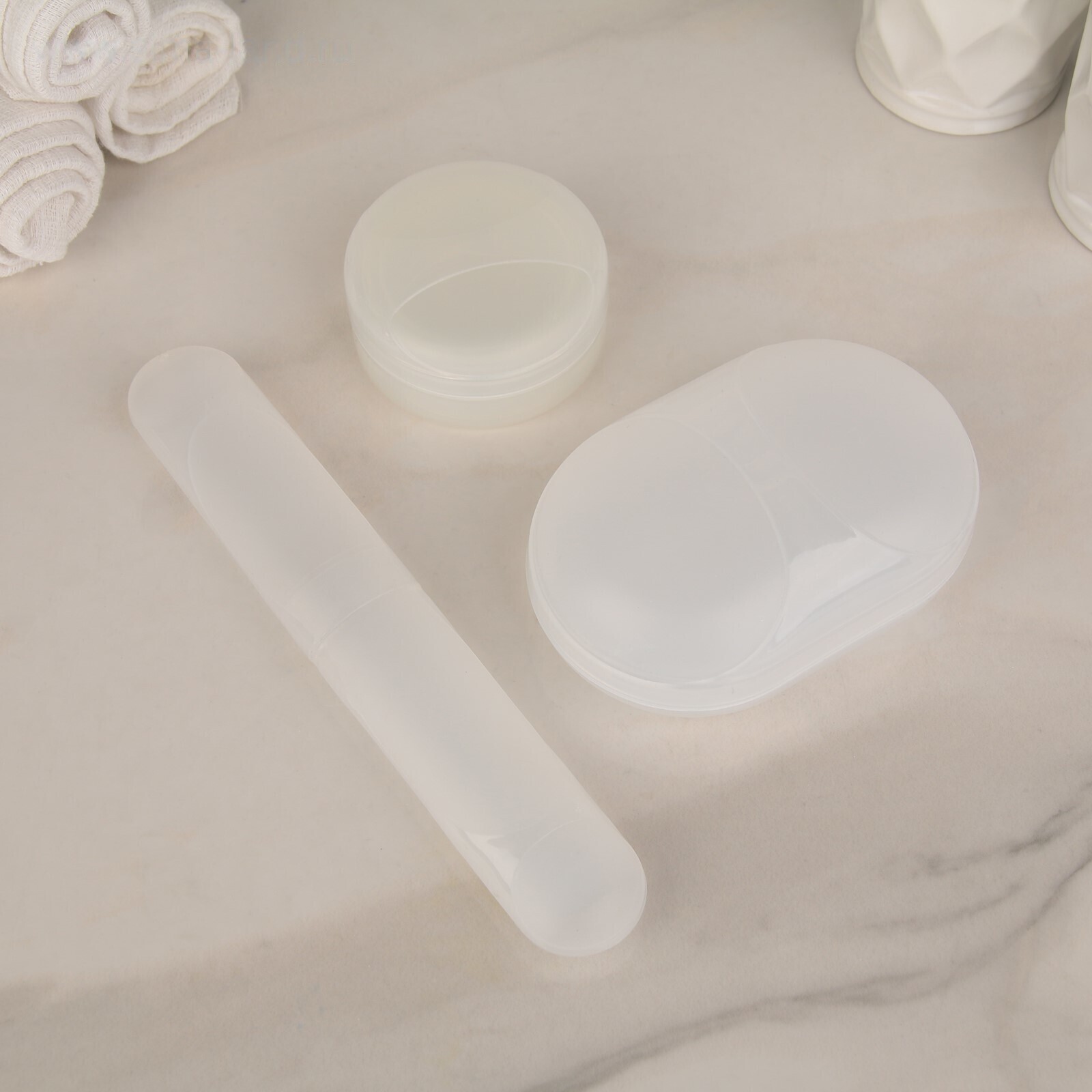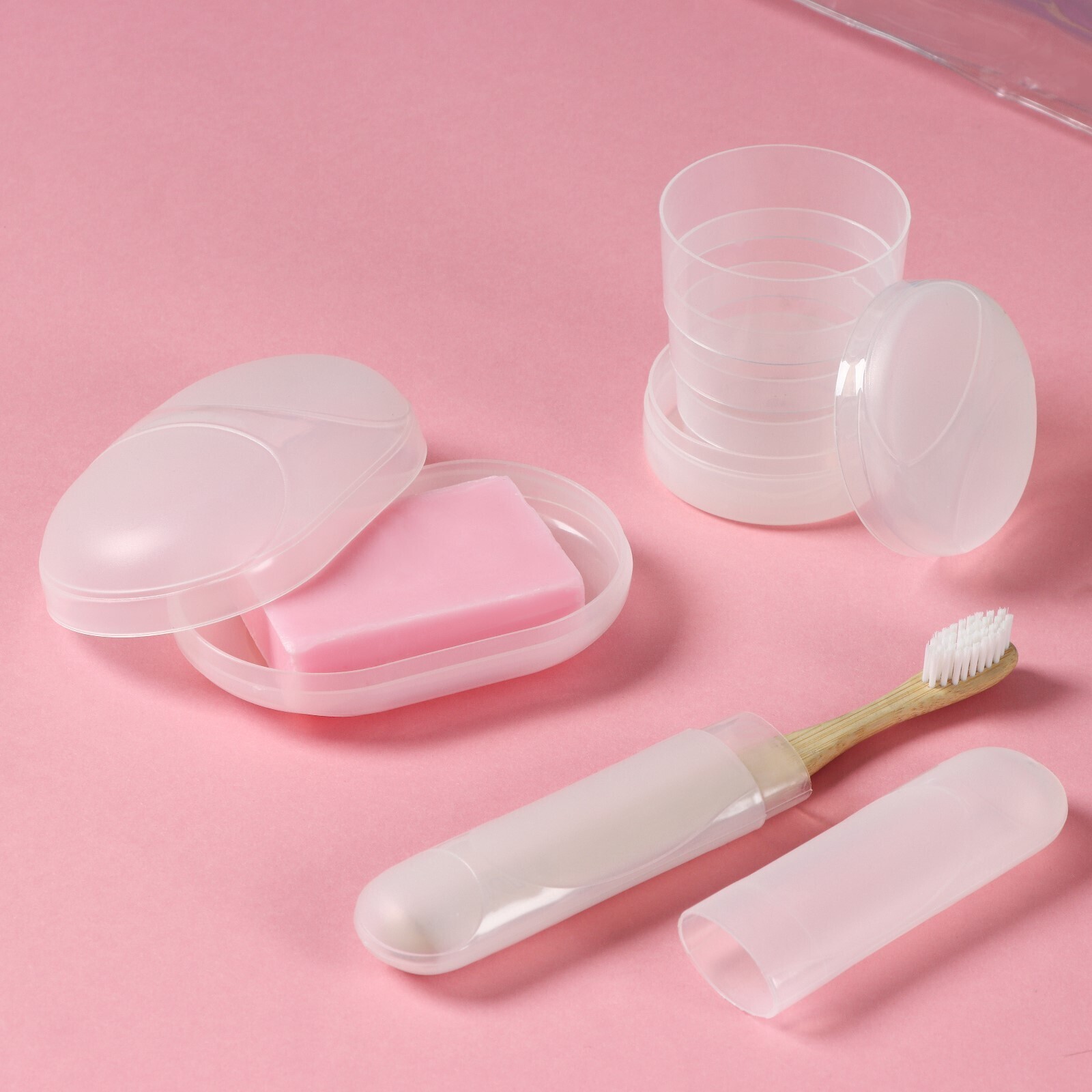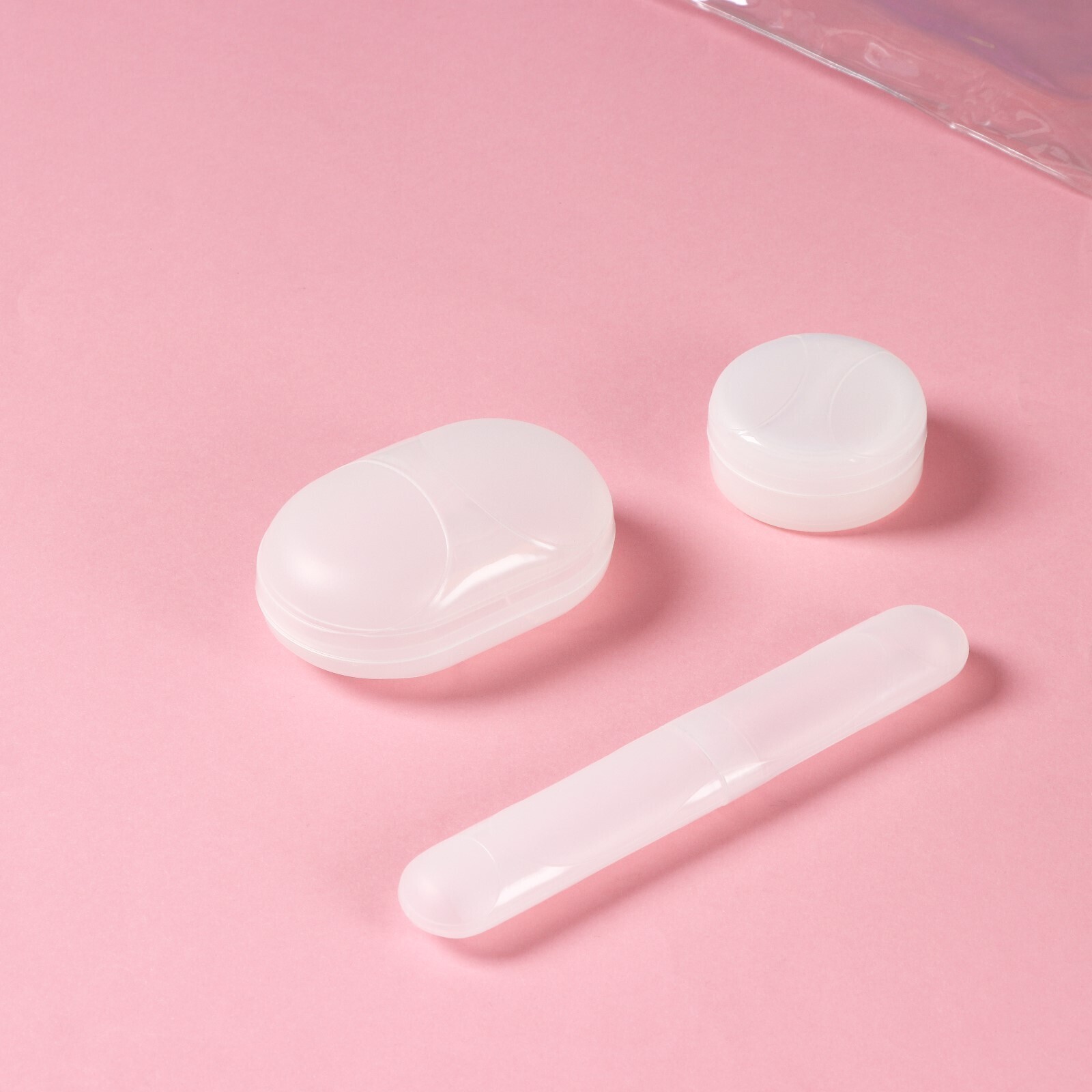 Набор дорожный, 3 предмета в косметичке: футляр для зубной щётки, мыльница, стакан складной, цвет прозрачный